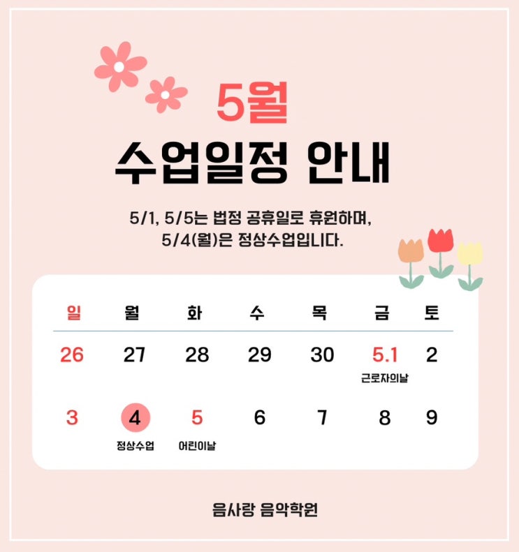 5월 수업일정 안내드립니다 ⠀ 5/1(근로자의 날), 5/5(어린이날)은 휴원이며, 5/4(월)은 정상수업입니다. ⠀ 일정 참고하시어 수업에 착오 없으시길 바랍니다 :) 음사랑음악학원 ✅ 교육과목 : 피아노, 드럼 ✅ 교육대상 : 유아반, 유.초.중.고등부 ⠀ 교육상담문의 ✅️ 본원 : 061.791.1611 광양시 사동로 186 3층 / 광양 마동초등학교 부근 ✅️ 2호점 : 061.791.3008 광양시 오류로 53 2층 / 광양 중앙초등학교 부근 ⠀ #광양피아노학원 #중마동피아노학원 #광양드럼학원 #중마동드럼학원 #광양음악학원 <img src="https://blogthumb.pstatic.net/MjAyNjA0MjNfMTQ2/MDAxNzc2OTM5ODYwMDQx.SWIp6IdTYEzxqIqEmgl1WSbvF9X_w7XVG9_dZaChi9sg.UKgZ4v0O7Blyt-A2z9Uk83TjvSRYhHznMCbVr3c24t0g.JPEG/%C7%CF%B4%C3%BB%F6_%B1%F2%B2%FB%C7%D1_%C8%DE%B9%AB_%C8%DE%C0%CF_%B0%F8%C1%F6_%BE%C8%B3%BB_%C0%CE%BD%BA%C5%B8%B1%D7%B7%A5_%B0%D4%BD%C3%B9%B0.jpg?type=s3" />