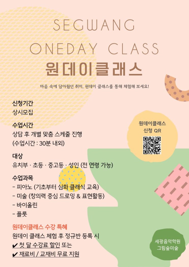 아이 첫 예체능 학원을 고민하시는 학부모님들께 부담 없이 시작해볼 수 있는 원데이클래스 체험 수업을 안내드립니다 :) 관악구 피아노학원, 미술학원, 음악학원을 찾으시는 분들께 아이의 성향과 수준을 먼저 확인하고 시작할 수 있는 좋은 기회입니다. 세광음악학원 & 그림숲미술에서는 기초를 탄탄히 다지는 수업과 함께 아이 스스로 이해하고 표현하는 힘을 키우는 교육을 진행하고 있습니다. 원데이클래스 모집 안내 ✔ 기간 : 상시모집! ✔ 시간 : 상담 후 개별 맞춤 스케줄 진행 ✔ 대상 : 유치부 · 초등 · 중고등 · 성인 수업 과목 - 피아노 (기초 · 클래식 중심 교육) - 미술 (창의력 중심 표현 수업) - 바이올린 / 플룻....... <img src="https://blogthumb.pstatic.net/MjAyNjA0MjJfMTI3/MDAxNzc2ODM5NjM1MTc3.llc_yUvb2BkB3UsHY5QCjbZQWtEvPWxU2RXLNDSbJdMg.7D6z71iS6Qa_2Ndu3GB4rAYOh5sJUlETX3ODf1cQi8kg.JPEG/%BF%F8%B5%A5%C0%CC%C5%AC%B7%A1%BD%BA%28%BB%F5%C7%D8%29.jpg?type=s3" />