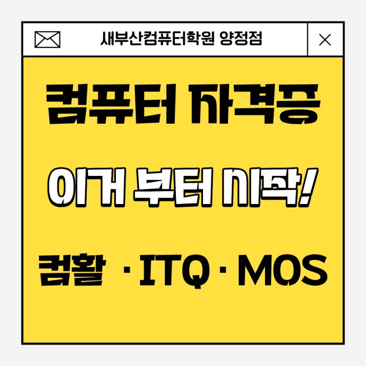 안녕하세요 새컴지기입니다 부산컴퓨터학원에서 컴퓨터 자격증 준비하려고 보면 가장 많이 드는 고민이 하나 있는데요 “컴퓨터 자격증 도대체 뭐부터 시작해야 할까?” 컴퓨터 자격증은 아무거나 시작하면 시간만 낭비될 수 있기 때문에 취업을 준비하는 분들이라면 특히 순서와 선택 기준이 정말 중요하다는 점! ITQ부터 해야 할지, 컴활이 더 중요한지, MOS까지 준비해야 하는지 헷갈려서 시작조차 못 하는 경우도 많으신 분들을 위해 새부산컴퓨터학원 양정점 기준으로 실제 취업에 도움이 되는 컴퓨터 자격증 순서와 선택 방법을 누구나 이해하기 쉽게 정리해 드리겠습니다 부산 안에서 컴퓨터 자격증 준비하고 계신다면 끝까지 읽어보....... <img src="https://blogthumb.pstatic.net/MjAyNjA0MTJfMTMx/MDAxNzc1OTg1MjMyMDMx.YZuNpzG3o3FrvcnjEjj3S2dzFwAvop_-FWcItpWcJAUg.ZfZ77dPwiYHje09JxR4nc78DLoQXh2BXX8lY3igA8ikg.JPEG/%C4%C4%C7%BB%C5%CD%C0%DA%B0%DD%C1%F5_%C0%CC%B0%C5%BA%CE%C5%CD_%BD%C3%C0%DB.jpg?type=s3" />