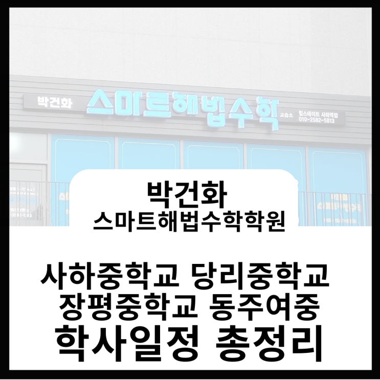 사하구에서 중학교를 보내고 계시는 학부모님들 학교 학사일정 많이 궁금해 하시지요? 학교 공문이 발송되는 교육 앱을 깔아두시지않으면 학교 소식도 학교 알리미도 받기힘듭니다. 그렇다고 10대 우리아이들이 친절하게 알려주지도 않습니다. 그래서 부산시 사하구 중학교중 사하중학교 당리중학교 장평중학교 동주여중의 26년도 주요 학사일정을 총정리하였습니다. https://blog.naver.com/hwanhi0310/224089865468 26년도 1학기 학사일정 중간고사 기말고사 여름방학 사하중학교 당리중학교 장평중학교 동주여중 사하구 중학교는 대부분 1학년 1학기가 자유학기제이므로 1학기 중간고사 기말고사에는 중2,3학년들만 치르게 됩니다. 사하중과 동....... <img src="https://blogthumb.pstatic.net/MjAyNjA0MDdfMjU5/MDAxNzc1NTI2NjY5ODY4.m4J791sZ4c5IXDxZlSyhA-TqdzmSf3xBBSHyCCA7Gr8g.N6Z7u7lGHBTyPpRw-wQ4PDeiIU2OpDlXDLv8VJzXKnEg.PNG/04%BA%ED-001_%282%29.png?type=s3" />