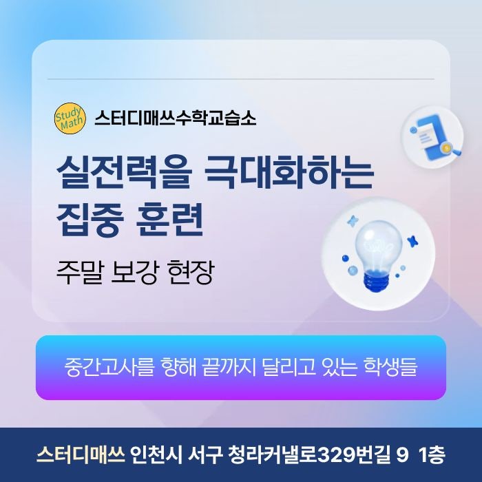 인천 서구 청라동에 위치한 스터디매쓰수학교습소는 20년간 교육 현장에서 쌓아온 경험을 바탕으로, ‘바르게 보고 바르게 가르친다’는 신념 아래, 수학의 기본을 단단히 다지는 데 집중합니다. 어느덧 벚꽃이 지고 중간고사가 코앞으로 성큼 다가왔습니다. 시험 기간이 되면 아이들도, 학부모님들도 긴장되기 마련이지만, 스터디매쓰 수학교습소는 그 긴장감을 확신으로 바꾸기 위해 매일 뜨거운 열기 속에서 내신 대비에 매진하고 있습니다. 꼼꼼한 내신 대비, 주말 보강 일정 및 학습 전략 현재 스터디매쓰 수학교습소는 오로지 우리 아이들의 성적 향상을 위한 철저한 내신 대비 체제로 운영 중입니다. 특히 평일 수업만으로는 아쉬웠던 심....... <img src="https://blogthumb.pstatic.net/MjAyNjA0MjRfMjE4/MDAxNzc3MDE0NDg4ODAx.yQGpUYzlUZgv8XUdO7gsyzI978n_YTJqhKXKm7h5to8g.0zMzJhMr1IASzI88W845_KOTZC1kCyebujK2Q5g4cuIg.JPEG/%C0%CE%C3%B5_%C3%BB%C8%A3%C1%DF_%C3%BB%B6%F7%C1%DF_%BC%F6%C7%D0_%281%29.jpg?type=s3" />
