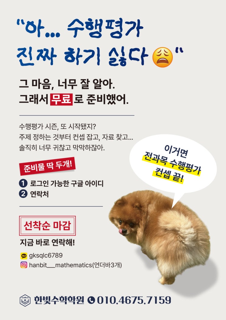 안녕하세요! 하나의 빛이 되도록 개성을 키워주는 한빛수학학원 입니다. "아... 수행평가 진짜 하기 싫다 " 가뜩이나 시험 기간이라 할 것도 산더미인데, 요즘 아이들 입에서 이 소리 안 나오나요? "수행평가 때문에 짜증 나"라는 말을 들을 때마다, 지켜보는 부모님 마음도 답답하실 겁니다. 주제 정하는 것부터 컨셉 잡고 자료 찾기까지... 수학 학원 원장인 제가 봐도 참 어렵고 아이들 진을 다 빼놓는 과정입니다. 이 시간에 기출 하나라도 더 풀고 오답 정리를 해야 하는데, 수행평가 붙잡고 끙끙대는 거 보면 정말 안타깝습니다. 그래서 한빛수학학원이 '무료'로 준비했습니다. 아이들이 수행평가에 시....... <img src="https://blogthumb.pstatic.net/MjAyNjA0MTJfMTM3/MDAxNzc1OTk5ODUyOTAz.abyD68ToRWAi6GQg3Hi3TaI24FCI-Fla4FgAi5EJts8g.171XfwdK22SH3PJbEV03A0pH5sXl2ZMV6fnYCBR2aHAg.JPEG/%BC%F6%C7%E0%C6%F2%B0%A1_%C6%F7%BD%BA%C5%CD.jpg?type=s3" />