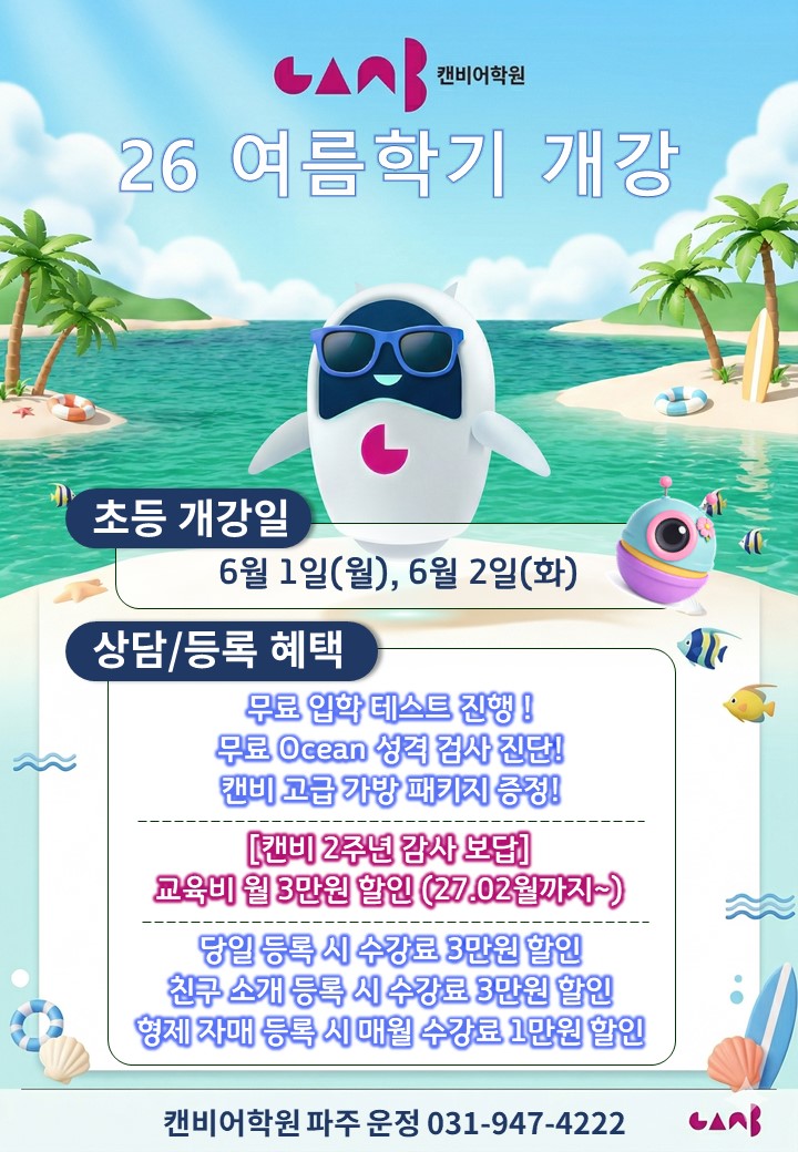 [캔비어학원 운정캠퍼스] 초/중등 여름학기(6/1~) 개강