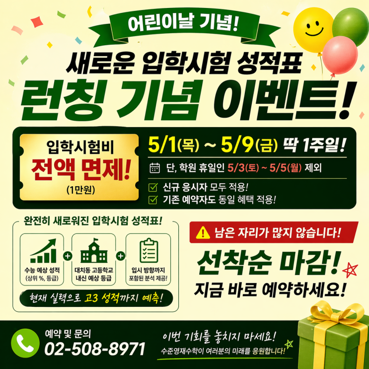 어린이날 기념 이벤트 “입학시험비 전액 면제” 수준영재수학의 새로운 입학시험 성적표 런칭을 기념하여 특별 이벤트를 진행합니다. 이벤트 내용 ✔ 기간 5월 1일 ~ 5월 9일 (단 1주일) ※ 단, 학원 휴일인 5/3(토) ~ 5/5(월) 제외 ✔ 혜택 입학시험비 전액 면제 (1만원) 신규 응시자 적용 기존 예약자도 동일하게 혜택 적용 이번 이벤트의 의미 이번 입학시험은 기존과 다릅니다. 새로운 성적표 시스템 런칭 현재 기준 수능 예상 성적 (상위 %, 등급) 대치동 고등학교 내신 예상 등급 입시 방향까지 포함된 분석 제공 단순 시험이 아니라 미래를 보여주는 입학시험 ⚠ 중요한 안내 현재 입학시험 예....... <img src="https://blogthumb.pstatic.net/MjAyNjA0MjRfMTgx/MDAxNzc3MDQwNTkzNzQy.I4AElRWDvnDbpzQgP3ZY0-HKD2P1X5kztWFy40DsrgMg.JAq-6mswSk5zj0Pz23B92RL98FS7rUXyGwSPU_WicDcg.PNG/file_00000000c5907206848286d4ac7960f2.png?type=s3" />