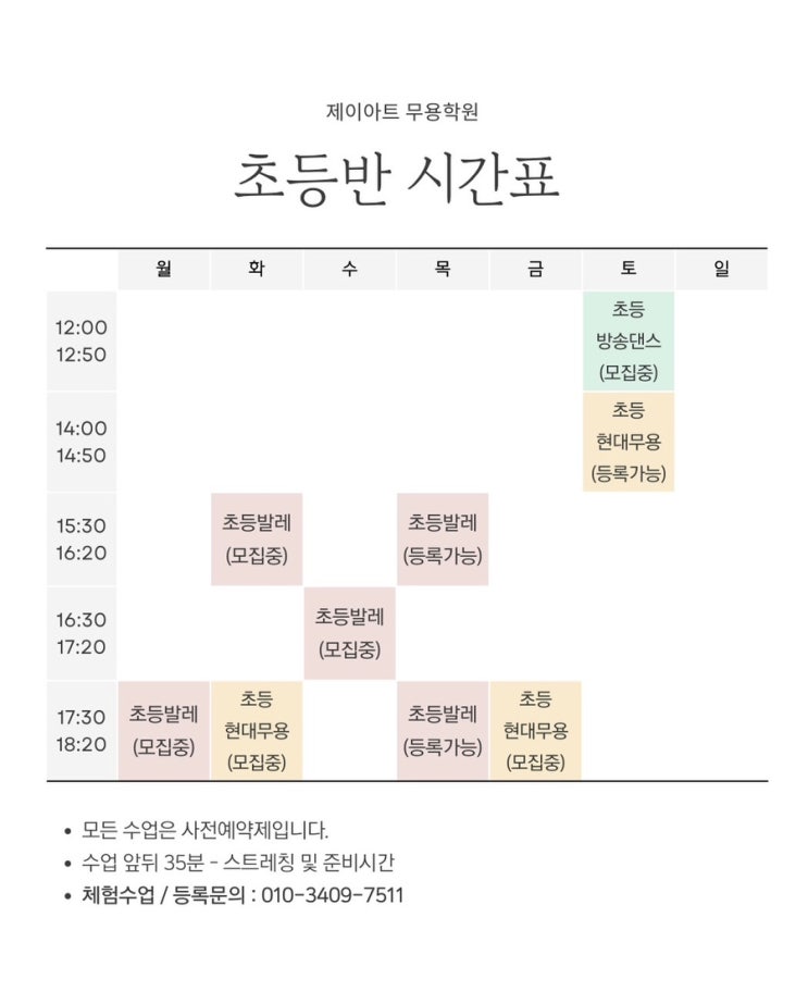 안녕하세요 제이아트무용학원입니다! 오늘은 초등반 시간표를 안내드리려고 해요~✨ 초등반은 무료체험수업이 가능하니 편하게 문의주세요 ♀️ 제이아트무용학원 상담 / 문의 번호 010-3409-7511 문자 확인이 가장 빠릅니다 :) 오늘도 행복한 하루 보내세요 <img src="https://blogthumb.pstatic.net/MjAyNjA0MTFfMTM4/MDAxNzc1ODk1MzYyMjY4.YtfxeuLf2iApiRM6pe8w0SZOQWwumyRhrHbUmk_Mn9sg.44cwSUGPNdwr0O73VI5p00WD6HLD-KGqGJ9uPu43Hokg.JPEG/611BA41E%A3%ADC73E%A3%AD45C6%A3%ADB48A%A3%ADA197355998D9.jpg?type=s3" />