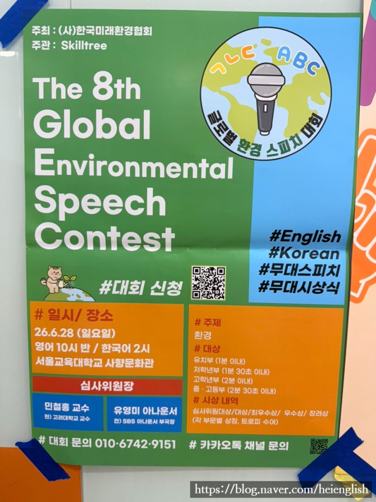 헤이잉글리쉬와 함께 무대에 서보세요! 제 8회 글로벌 환경 영어 스피치 대회 참가자 모집 ━━━━━━━━━━━━━━━━━━━━━━ 안녕하세요, 헤이잉글리쉬 Jasmine 선생님입니다. "우리 아이가 영어로 자신의 생각을 말할 수 있을까?" 많은 부모님들이 이런 고민을 하세요. 오늘, 그 고민을 행동으로 바꿀 수 있는 기회를 소개합니다. ━━━━━━━━━━━━━━━━━━━━━━ 제 8회 글로벌 환경 스피치 대회 (영어 부문) 주최 : (사)한국미래환경협회 주관 : Skilltree 환경이라는 주제로 아이들이 영어로 자신의 생각과 메시지를 직접 무대에서 전달하는 대회입니다. 기후변화, 멸종위기 동물, 환경보호… 아이들이....... <img src="https://blogthumb.pstatic.net/MjAyNjA0MTlfMjk1/MDAxNzc2NTg2NTcwMTU0.NAgt_JqSz4iLHJ19Kttm90yWAZGcMPyDmbR0zpb_kd8g.Idx4iIE7bu25WLwNQZGnLVZAvgHw2nGMY9kpRpq50Nsg.JPEG/IMG%A3%DF8680.jpg?type=s3" />
