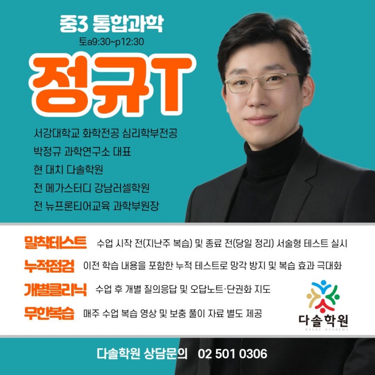 ▶ 정규T 통합과학 서강대학교 화학전공 심리학부전공 박정규 과학연구소 대표 현 대치 다솔학원 전 메가스터디 강남러셀학원 전 뉴프론티어교육 과학부원장 ▶수업구성 ▶강의스타일 ▶완벽을 기하는 수업 관리 시스템 밀착 테스트 : 수업 시작 전(지난주 복습) 및 종료 전(당일 정리) 서술형 테스트 실시 누적 점검 : 이전 학습 내용을 포함한 누적 테스트로 망각 방지 및 복습 효과 극대화 개별 클리닉 : 수업 후 개별 질의응답 및 오답노트·단권화 지도 무한 복습 : 매주 수업 복습 영상 및 보충 풀이 자료 별도 제공 ▶통합과학 (물리, 화학 단원) 4월 물리 : 힘, 뉴턴법칙, 자유낙하, 수평투사운동 (통합과학1 3단원 물리학 1단원) 5월 물....... <img src="https://blogthumb.pstatic.net/MjAyNjA0MjRfMjM1/MDAxNzc3MDE2MzM0ODQ2.dezbAuJYwPa6WhFc9y-doD_fOtjG2DulZSwKpjDvny8g.LpWt2PpVSdyU_jh_WRukmmihZrUKjAAmjNMKm71O3J8g.JPEG/%B9%DA%C1%A4%B1%D4.jpg?type=s3" />