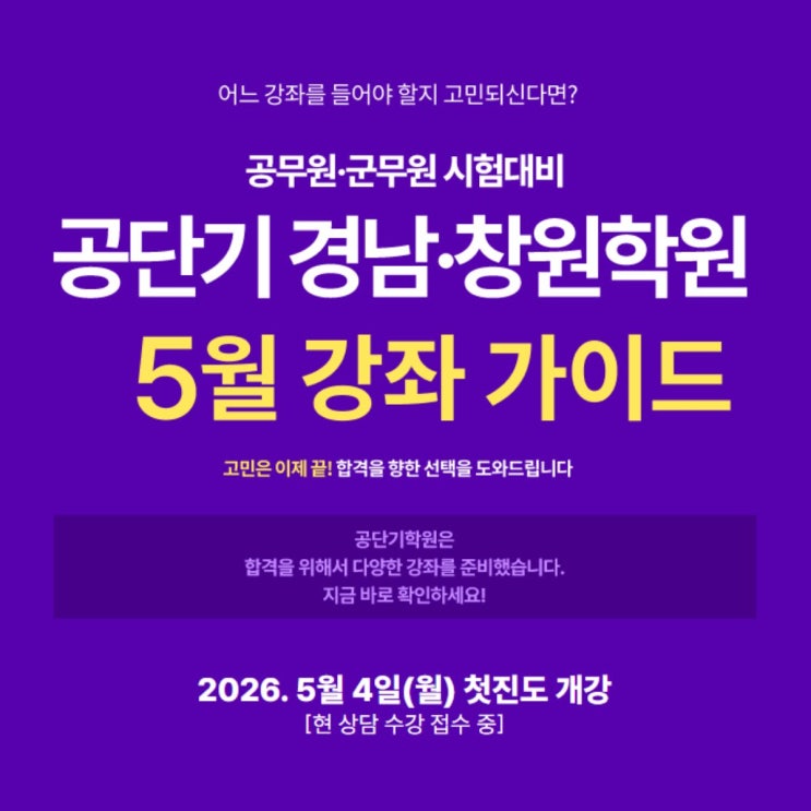 안녕하세요 창원·경남·부산 지역에서 많은 분들의 합격을 함께해 온 매일 조금씩, 하지만 확실하게! 합격의 길을 함께 걷는 공단기 경남·창원학원입니다 5월 첫진도 개강 공단기 경남·창원 학원 5월 개강안내 2027 시험 대비! 시험을 준비하는 모든 수험생 여러분을 위한 5월 개강 소식을 가지고 왔습니다~~! 2026년 5월 4일(월) 첫진도 개강! ✨ 5월 개강 특별 혜택✨ 최대 460만원 수강료 할인 (12개월 수석반 등록 시) PC+모바일 동영상강의 무료 제공 합격전문가와 함께하는 1:1 맞춤 컨설팅 지금 등록하고 더 많은 혜택도 함께 챙기세요 2026 9급 지방직 실전모의고사 실....... <img src="https://blogthumb.pstatic.net/MjAyNjA0MjNfMjUx/MDAxNzc2OTIwMjIwMjk2.HKmD7hEdOiR7eFDLpClwKWpZR7FBHGKhCvh7KPq9Sv4g.JJyRCAXcyZvIMd-DWGzXNU_KdVki-35eZZi8XLulWxsg.JPEG/1.jpg?type=s3" />