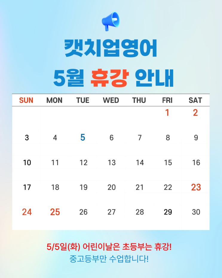 하늘은 푸르르고 온 세상 모든 것이 살아나고 피어나는 따뜻한 5월입니다. 유천 캣치업 영어 5월 휴강 일정 및 이벤트를 알립니다. 저희 학원 영어는 4월 말에 중고등부 모든 시험이 마무리 됩니다. 이 번에 중고등학교에 새롭게 입학하여 첫 시험을 보기에 매우 긴장되는 아이들도 있고, 이미 수차례의 시험을 봤음에도 불구하고 등급을 놓고 경쟁해야 하는 상황에서 최선을 다하고 있는 아이들도 있습니다. 모두 후회 없는 시험을 치를 수 있기를 바랍니다. 저희 '캣치업 영어'는 5/1일(금)~5/2일(토) / 5월 23일(토)~5월 25일(월) 휴강임을 알립니다. 5/5일(화) 어린이날은 초등부는 휴강, 중고등부는 정상수업을 진행합니다. 5/4일....... <img src="https://blogthumb.pstatic.net/MjAyNjA0MThfMTk2/MDAxNzc2NTAwMjAwMzk5.GPIKisPAZCR60nnOEHzRjUnp9NoIzGPWM9WJTTqS0Icg.2r62NvYGYd2JF7BkVjl6hhgEoV3Ksuu4x2mhl75AdTYg.PNG/%C4%B9%C4%A1%BE%F7%BF%B5%BE%EE5%BF%F9%C8%DE%B0%AD%BE%C8%B3%BB.png?type=s3" />