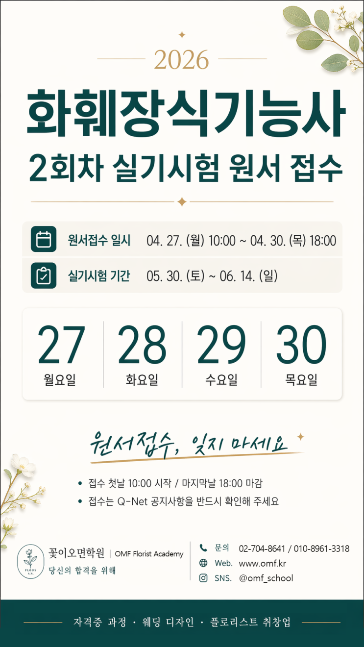 안녕하세요, 꽃이오면학원입니다 2026년 화훼장식기능사 2회차 실기시험 원서접수 일정이 다가왔습니다. 시험을 준비하고 계신 분들은 아래 일정을 꼭 확인해 주세요! ✅ 원서접수 일정 접수 기간 : 2026. 04. 27(월) 10:00 ~ 04. 30(목) 18:00 실기시험 기간 : 2026. 05. 30(토) ~ 06. 14(일) 접수처 : Q-Net (www.q-net.or.kr) ⚠️ 접수 시 꼭 확인하세요 접수 첫날은 10:00부터 시작됩니다 마지막날은 18:00에 마감되니 여유 있게 접수하세요 접수 전 Q-Net 공지사항을 반드시 확인해 주세요 시험을 준비하고 계신 모든 분들을 응원합니다! 궁금한 점은 언제든지 문의 주세요. 02-704-8641 / 010-8961-3318 omfkorea@nav....... <img src="https://blogthumb.pstatic.net/MjAyNjA0MjRfMjg4/MDAxNzc3MDI1NDA1MjU0.ZoX5ZXGhzlpG-EXQhnR1Y6VCTzAxNn06xGXw-EXRSNMg.zYIlUIbBJ7dOba5WmaaR1i-p01I-osAqDhZjk-WeY2Ug.PNG/ChatGPT_Image_2026%B3%E2_4%BF%F9_24%C0%CF_%BF%C0%C8%C4_06_24_49_%BA%B9%BB%E7.png?type=s3" />