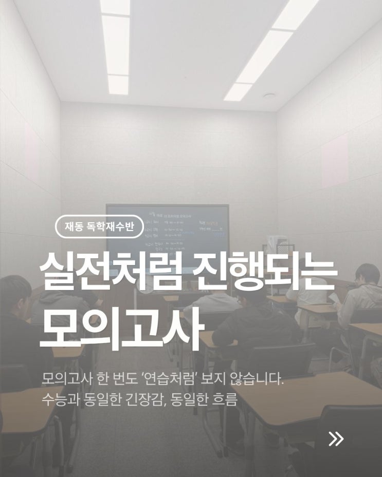안녕하세요, 재동학원 & 재동독학 관리형독서실입니다. 오늘은 재동 독학재수반에서 진행되는 모의고사 실시 현장을 공유드리려고 합니다. 수험생에게 모의고사는 단순한 시험이 아니라 실전 감각을 기르고, 현재 위치를 점검하는 중요한 과정입니다. 재동 독학재수반에서는 실제 수능과 최대한 유사한 환경을 조성하여 모의고사를 진행하고 있습니다. - 시험 시간 엄수 - 실제 시험과 동일한 긴장감 유지 - 불필요한 이동 및 소음 최소화 학생들이 ‘연습’이 아닌 ‘실전’처럼 시험에 임할 수 있도록 관리하고 있습니다. 사진에서 보실 수 있듯, 모든 학생들이 흐트러짐 없이 집중하여 시험에 임하고 있는 모습을 확인하실 수 있....... <img src="https://blogthumb.pstatic.net/MjAyNjA0MjNfMjQ4/MDAxNzc2OTMxMjM1NjA5.A3YYTjSJCzwJu4MJumAxSMU5-_sSmbLyAtD_emRuQH0g.YrSGhrm2045opKhjlpoxruzoRz4QAmsrL8Iu-XmpgHMg.JPEG/1.jpg?type=s3" />