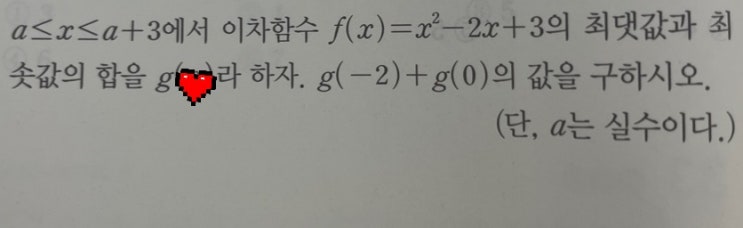 안녕하세요. 지산동범물동하트수학학원입니다. 다음주 있을 중간고사에 임하며 지난 몇 주간 토일 모두 함께 학습하고 지도하였는데요. 이제 그 결실을 맺을 시간이 다가왔습니다. 준비는 잘 되어 있나요? 마지막까지 최선을 다해 주시기 바라며 일반적으로 어려워하는 공통수학1문제 하나 풀이하려 합니다. 많은 학교들에서 기출될것으로 추정되니 대충하지 마시고 정확히 연습하시기 바랍니다. 문제부터 볼께요. 이차함수 최대최소문제인데요. 충 분 한 고 민 후 풀이 보세요.~^^ 손풀이 볼께요. 풀이1인데요. 서술형식으로 작성해봤구요. 빠른 풀이도 준비해봤답니다. 두번째 풀이는 최근 모의고사에 자주 출제되었던 거라 모의고사를 많이 다....... <img src="https://blogthumb.pstatic.net/MjAyNjA0MjFfMjA0/MDAxNzc2NzUzNDc1MTYx.jXG4WeyNtakFcvQ_wdR_Lj0uNIwv15YsIz5G3J0hbhcg.-apJmPU-w0tYBQUrgsHVXJUNpCcoDBhZhWGZbI6MKGwg.JPEG/20260421_153206.jpg?type=s3" />