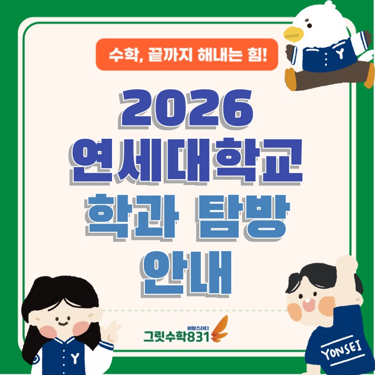 수학! 끝까지 해내는 힘. 안녕하세요~ 수성구 수학학원 내신대비 전문 그릿수학831학원입니다 :) 오늘은 연세대학교에 관심이 많은 학생이나 아직 대학 학과나 진로를 구체적으로 정하지 못해 고민인 학생들 주목해 주세요~ “대학생에게 직접 듣는 전공 이야기, 진로의 방향을 바로 잡습니다!” 우리 자녀, 아직 진로 방향이 막막하신가요? 단순 '정보'보다 직접 겪은 '경험'이 진로 결정에 큰 역할을 할 수 있습니다. 연세대학교 선배가 직접 학생에게 알려주는 멘토링을 통해 막연한 진로를 구체적 목표로 바꿀 수 있는 기회! 직접 연세대학교를 방문하지 않아도 편하게 집에서 줌으로 탐방이 가능합니다 2026연....... <img src="https://blogthumb.pstatic.net/MjAyNjA0MjJfMjc4/MDAxNzc2ODQ4MTk0Mjk0.IITzQsmaAFvvR9-i1HLHGAVOEVIQZ-FqGw4QjoxQMVAg.jqxQ97p3AoxJzSYMxDzZH_traPlzq0uboF9QDqmPvQkg.JPEG/%BA%ED%B7%CE%B1%D7-%BD%E6%B3%D7%C0%CF-001_%287%29.jpg?type=s3" />