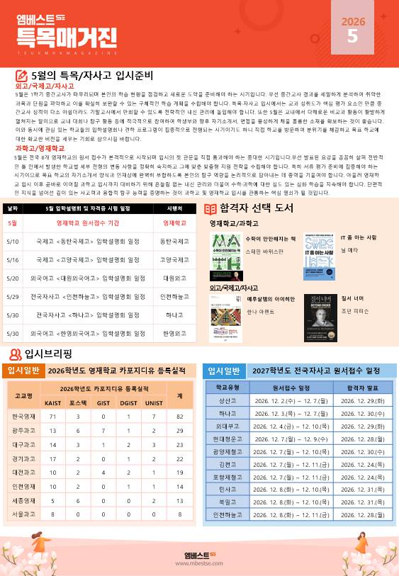 특목매거진 중등 학습정보 초등 학습정보 5월도 파이팅입니다~!^^ 감사합니다. <img src="https://blogthumb.pstatic.net/MjAyNjA0MjRfMjE0/MDAxNzc3MDI5NDA0NDA1.VlEzNTcYMLs2W5ftGKmuLB5q6xaElD6Zxop0ET23zXUg.tEjWjpWlZNBHM7AYBBC3OL3CLBXsL7O90kjbIqz5PoEg.JPEG/2026.5_%C6%AF%B8%F11.jpg?type=s3" />