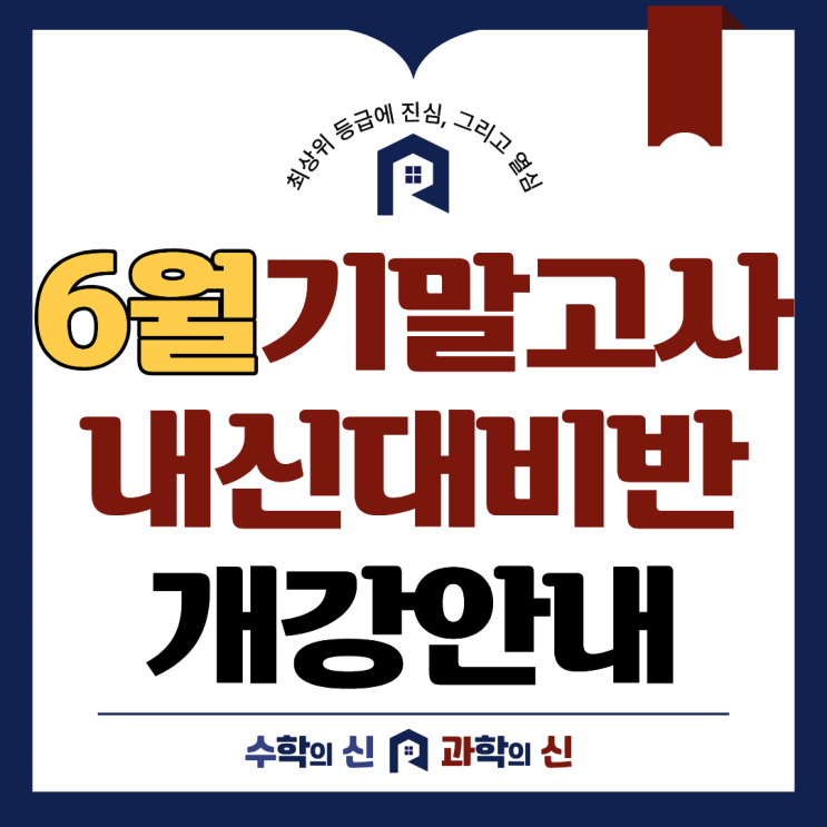 안녕하세요. 최상위등급에 진심, 그리고 열심인 [수학의신과학의신] 학원입니다. 2026년 6월 기말고사 내신대비반이 개강합니다. 중간고사가 끝났다고 해서 잠시 여유를 가지는 경우가 많지만, 실제로는 이 시기부터 기말고사 준비가 시작됩니다. 특히 6월 기말고사는 1학기 성적을 완성하는 시험이기 때문에 준비 시점과 방식에 따라 결과 차이가 크게 나타납니다. 어떤 순서로 공부하고, 어디에 집중해야 하는지에 따라 같은 시간이라도 결과는 달라집니다. 저희 수학의신·과학의신 학원에서는 6월 기말고사를 대비하여 내신 성적에 실질적으로 도움이 되는 맞춤형 대비 과정을 운영합니다. 개강 안내 개강일 : 2026년 5월 9일 (토) 모집....... <img src="https://blogthumb.pstatic.net/MjAyNjA0MjZfNDgg/MDAxNzc3MTY4MzEyNzA3.w459x9XJlsHq4JlrO70-rhmVVvD7FaEs1rcdhROA3Rkg.yR6iqRPHlPDwJc2v2uOoHEIWLTokkN94XK01o__AvgEg.PNG/%B0%B3%B0%AD%BE%C8%B3%BB_%283%29.png?type=s3" />