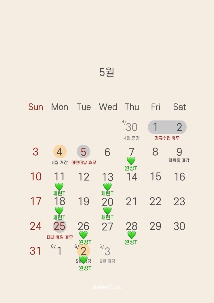[ 강남서초점 5월 오전 수업 변경 안내 ] 안녕하세요, 발레앤코입니다. 현재 수강중이신 원장님 진행 오전 클래스 5월 수업으로 안내드립니다. 원장님께서 사정으로 5월 2,3주차 자리를 비우시게 되어 부득이 5월 수업만 아래와 같이 변경하여 진행할 예정입니다. 5월 오전 베이직&레벨1 수업은 2,3주차만 <월요일&수요일>로 변경하여 <오채린> 선생님과 함께합니다 ◾수업 시간(기존과 동일) - 오전10:00~11:20 / 베이직 - 오전 11:20~12:40 / 레벨1 ✔5월 수업 일정 1회차 : 5월 7일 목요일 / 원장T 2회차 : 5월 11일 월요일 / 오채린T 3회차 : 5월 13일 수요일 / 오채린T 4회차 : 5월 18일 월요일 / 오채....... <img src="https://blogthumb.pstatic.net/MjAyNjA0MjFfMjE0/MDAxNzc2NzY0MTQzNDcx.9TPdufio_iiQMCPmQpq9ze0D-UtDg6Bku0-VHBKUCL4g.s2PZUXsPeYS4PwcVo-txiUzvUGdHTTaCHM8CUFtO-1Ug.JPEG/26%C0%CE%BD%BA%C5%B8_%C0%CF%C1%A4%C7%A5-5%BF%F8%C0%E5%B4%D4%BF%C0%C0%FC%B9%DD.jpg?type=s3" />