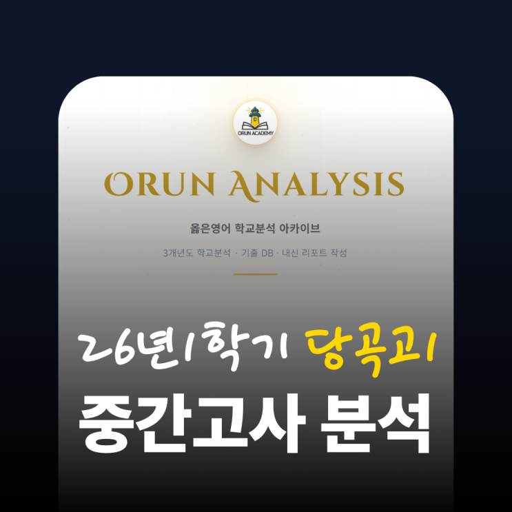 안녕하세요, 옳은영어입니다. 이번 중간고사를 치른 학생들이 자신의 실력을 정확히 점검하고 부족한 부분을 채워 나갈 수 있도록, '중간고사 상세 분석 리포트'를 준비했습니다. [당곡고1학년 중간고사 분석 리포트] [당곡고1학년 중간고사 분석] 시험 특징 & 킬러 문항 이번 시험에서 가장 특이한 문제는 서답형 4번 문항입니다. 이 문항은 밑줄 친 부분의 함의 파악과 영작을 결합한 매우 참신한 유형으로 출제되었습니다. 단순 암기만으로는 해결이 불가능했던 유일한 문항이자, 지문에 대한 깊이 있는 이해와 문장 구성 능력을 동시에 요구한 '킬러 문항'이었습니다. 결과적으로 대다수 문항에서 성실도를 평가했다....... <img src="https://blogthumb.pstatic.net/MjAyNjA0MjNfMTkz/MDAxNzc2OTQyOTc3NjU5.LJ5BFT6r9ou0ItVfxY_CBvJG4Lgu7buA902QKJNwrJkg.wKYJpj07raJcPyqX8Rs3y2T5WzwG8aW_RIykx15x7Fkg.PNG/%BD%E6%B3%D7%C0%CF_%284%29.png?type=s3" />