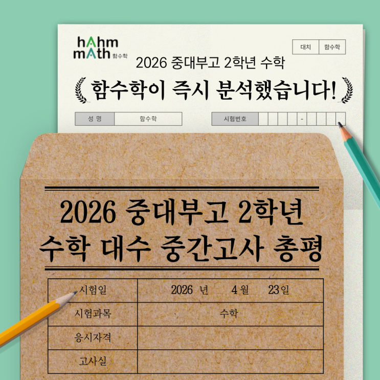 안녕하세요, 대치 함수학학원입니다. 오늘 중대부고 2학년 1학기 수학 중간고사 치른 학생 여러분, 정말 고생 많으셨습니다. 시험 직후 학생들의 표정만 보아도 이번 시험이 결코 만만치 않았음을 알 수 있었는데요. 함수학 이현정 선생님이 오늘 시험을 즉시 분석했습니다. 지금 바로 공유해 드리겠습니다. "모의고사만 준비했다면 오늘 많이 당황했을 것입니다." 분석 강사 소개 이현정T | 함수학학원 서울대학교 출신 함수학 수학 전담 강사 중대부고 내신 수학 출제 경향 정밀 분석 담당 1. 문항 구성 및 단원별 난이도 이번 시험은 총 22문항으로, 단답형과 서술형의 배점이 상당히 높아 정확한 풀이 과정이 중요했습니다. 1단원....... <img src="https://blogthumb.pstatic.net/MjAyNjA0MjNfMjEy/MDAxNzc2OTUzMTQ4MTE3.rf0ZowM_Ha7uYkyO9I_FqOnoLJljpPeTLDxhppN9ikIg.zypE6f2H0R1SDEsCryPn8Zp66UjG-vRN4ikbo1OmvJIg.PNG/%C1%DF%B4%EB%BA%CE%B0%ED_%C1%DF%B0%A3_%BA%D0%BC%AE%28%C7%D4%BC%F6%C7%D0%29.png?type=s3" />