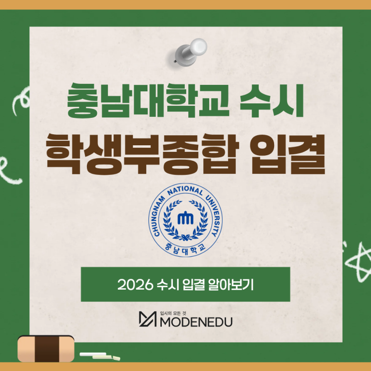안녕하세요! 결과가 다른 입시의 시작 모든에듀케이션입니다. 2026학년도 입시가 끝나고 2027학년도 입시를 위해 많은 분들이 관심을 갖고 계실거라 예상됩니다. 힌트를 드리자면 그 중에서도 가장 먼저 시작과 마무리가 진행되는 수시 시즌은 벌써부터 많은 분들이 신경을 쓰고 계실 것 같은데요. 수시 전형 중에서도 지속적으로 변화가 발생한 학생부종합전형에 대해 알아보고자 합니다. 이번에 알아볼 정보는 충남대학교 수시 학생부종합전형 입결입니다! 수시 학생부종합전형의 전형 방법 및 특징 2024학년도 대입부터 자소서가 아예 폐지되며 수시에 반영되는 생활기록부 역시 매우 간소화되었습니다. 봉사활동이나 교내 수상경력 등 많은 요....... <img src="https://blogthumb.pstatic.net/MjAyNjA0MjRfMTYz/MDAxNzc3MDI2OTAzNjM2.ohT4DVQ9IWZzv9rsH546kYuIW9Kuu09OnLn5LEFV1QAg.241hSeeQAuz1xC7Jn8KdEZuVOfDwoYWzSqnKYQoXmFIg.PNG/1.png?type=s3" />