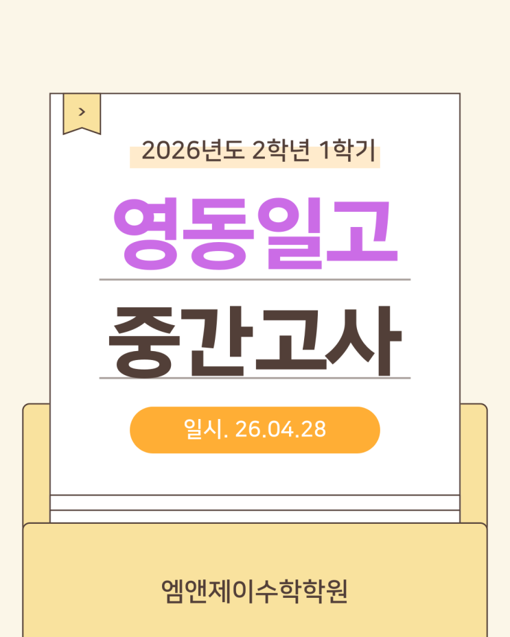 안녕하세요. 엠앤제이수학학원 입니다. 오늘은 영동일고 2학년 1학기 중간고사 대수시험을 치뤘는데요. 모두의 멘탈....안녕하신가요??? 음 작년과는 다르게 역대급(?)으로 난이도가 올라간듯 하여 많이 당황했을것 같습니다. 우선 객관식이 총 17문제였는데 어렵게 느낄만한 문항이 5문제 정도 였고 서술형도 2-3문제는 나이도가 있다고 판단하여 시간이 많이 부족하였을 것이라 생각이 듭니다. 또, 객관식과 서술형에 지수에서 순서쌍의 갯수를 세는 문제가 각각 한개씩....ㅎㅎ 전체적으로 1학년때보다 난이도가 대폭 상승하였다고 생각합니다. 어려운 문항의 비중도 많이 늘었구요.ㅠㅠ 그래도 기죽지말고!! 틀린문제는 꼭 다시 풀어보도록 합....... <img src="https://blogthumb.pstatic.net/MjAyNjA0MjhfOSAg/MDAxNzc3MzY4OTYwNTUz.1TCxLRyyuuUQHGqXKd5svUUtgQrxKBAGk9tP24nV6mgg.2tZDUjoHLy9pUNy3dG2IY0FtVpaemQZlg0jlUufoPpAg.PNG/card_news_%286%29.png?type=s3" />