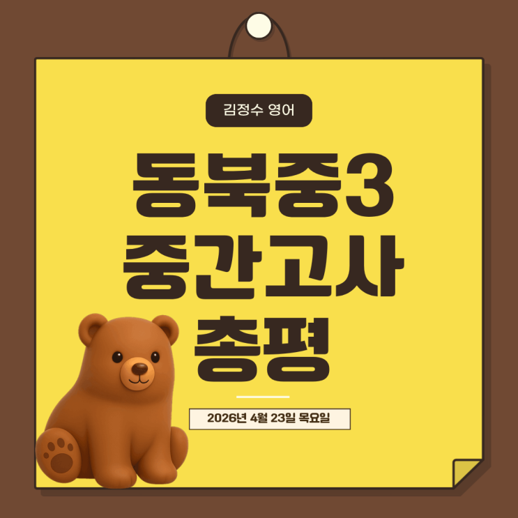 안녕하세요 김정수 강사입니다! 오늘은 지난주 목요일에 시행된 '동북중 3학년 1학기 1차 정기고시' 시험의 유형과 난이도를 살펴보려 합니다. 1차 정기고시 문항 수와 문제 유형은 다음과 같습니다. 객관식 20문제 + 서술형 10문제 총 30점 만점 시험이었으며, 문제 유형은 다양하게 출제되었으나 주로 어법과 어휘를 중심으로 시험 문제가 출제되었으며, 타학교와 유난히 구별된 점은 해석 문제라고 할 수 있습니다. 문제 유형과 난이도를 살펴보면 동북중 영어 선생님들께서 수일치, 분사, 분사구문, 선행사 포함한 관계대명사 what을 비롯한 관계사에 대한 어법 이해도 중요시하시지만 문장 해석을 강조한다는 것도 알 수 있습니다....... <img src="https://blogthumb.pstatic.net/MjAyNjA0MjlfMTUy/MDAxNzc3NDQzODY3Mjk3.-IO1DVgh6awo79jqoUEMyctRqknb9A7nxQwcYDsTZdAg.54NycrzYJQUMcRNhb7EZOtUe1Ja49OKq1IHNgl1vf9Mg.PNG/KakaoTalk_20260429_145653721_04.png?type=s3" />
