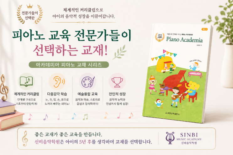 “ 피아노 교육 전문가들이 선택하는 교재! ” 안녕하세요. 신비음악학원입니다 많은 학부모님들께서 이런 질문을 주십니다. “왜 신비음악학원은 이 교재를 사용하시나요?” “다른 학원과 교재가 뭐가 다른가요?” 오늘은 신비음악학원이 오랜 시간 검토 끝에 아카데미아 교재를 선택한 이유를 소개해드리겠습니다 → 피아노 교육 전문가들이 선택하는 교재 피아노 교육에서 교재는 단순히 ‘ 문제집 ’ 이 아닙니다. 어떤 교재를 선택하느냐에 따라 아이의 독보력, 음악성, 이해력, 사고력이 완전히 달라질 수 있습니다. 1. 아카데미아는 ‘다중감각 교육 ’ 을 기반으로 합니다. 아카데미아는 단순히 보고 따라 치는 교재가 아닙니다. 눈....... <img src="https://blogthumb.pstatic.net/MjAyNjA0MjZfOTUg/MDAxNzc3MjA1NTIxNTc3.MhhyflbMVju7eS35MNjKyEhTFzbP1YTaOsLLShTseQEg.3mQolRpB7YWFP0EOYsMKwr7UzyNEDRki1Dz3IQd7vr4g.PNG/900_file_00000000995872069f1072803f41a75f.png?type=s3" />