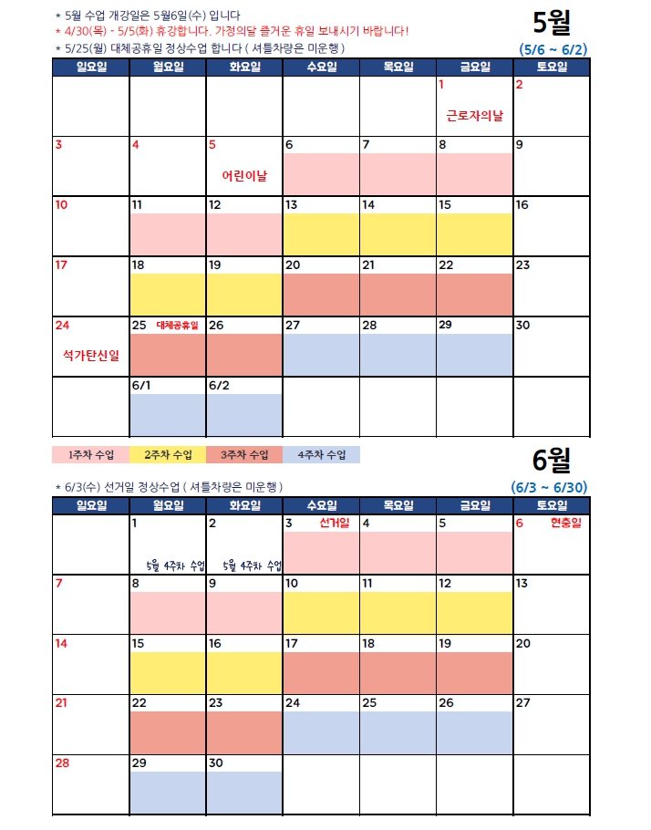 안녕하세요! 더 로얄 발레 2026년 5월~ 2026년 6월 안내드립니다 5월 ( 5/6 ~ 6/2 ) 6월 ( 6/3 ~ 6/30 ) ★ 공 지 ★ ● 4/30(목) - 5/5(화) 어린이날, 근로자의날 휴강합니다 ● 5/25(월) 대체공휴일 정상수업 ● 6/3(수) 선거일 정상수업 * 저희 더 로얄 발레 아카데미는 이레음악학원 (7층), 진아트슐레 미술학원 (6층)과 연계학원으로 함께 수강시 할인혜택을 드리고 있습니다. 전화 혹은 문자 문의 그리고 방문 상담 모두 환영합니다! 더 로얄 발레 학원 송파구 위례광장로 188 아이온스퀘어 7층 ☎ 상담문의 010-5919-1603 <img src="https://blogthumb.pstatic.net/MjAyNjA0MjhfMTMx/MDAxNzc3MzYxNzk4MDg5.nknqGqj-OG0NbsWKulV5FWp2EKAKRD1EKTqddSqvjuEg.9CI2SrvReQiaFmZRWYEmSKLetUKJwvIB8RXNu7Qh8_og.JPEG/5%BF%F9-6%BF%F9.jpg?type=s3" />