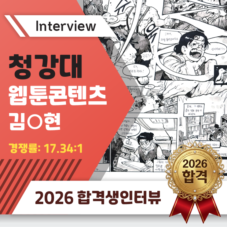 청주만화학원 인트로 2026학년도 합격 인터뷰 1 - 청강대 웹툰콘텐츠전공 합격 재현작 및 인터뷰 (청주애니학원, 청주미술학원, 청주웹툰학원) 365일 열정이 가득한 곳 청주 인트로만화학원! 안녕하세요~ 청주만화학원 인트로입니다.. 어느덧 2026학년도 입시는 마무리가 되었고 봄과 함께 2027학년도 입시가 본격적으로 시작되었는데요.. 당분간은 2026학년도 합격생들의 생생한 합격 후기와 재현작을 가지고 올게요 첫 스타트~ 청강대학교 4명의 합격생 중 웹툰콘텐츠전공에 합격한 학생 인터뷰 및 합격 재현작을 보실게요 청강문화산업대학교 웹툰콘텐츠전공 117명 모집에 무려 2029명 지원!! 경쟁률 17.34대 1.. 높은 경쟁률을 기록하였는데....... <img src="https://blogthumb.pstatic.net/MjAyNjA0MTFfMTgy/MDAxNzc1OTE5NDk3NDg2.I8jx8cRx-096r7K5pgkwDiQlT5oB-u5TBEbmP_89xMIg.B1XhI2U0u4MLoF5eR1co32wtPh5Zzk0xIKQjuQSORmIg.PNG/%C3%BB%B0%AD%B4%EB_%C7%D5%B0%DD%BB%FD%C0%CE%C5%CD%BA%E4_%BD%E6%B3%D7%C0%CF-%C3%BB%C1%D6%C0%CE%C6%AE%B7%CE%B8%B8%C8%AD%C7%D0%BF%F8.png?type=s3" />