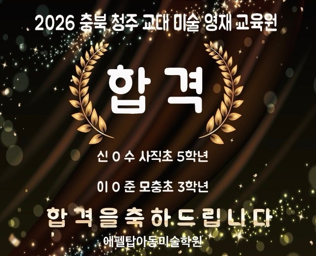 안녕하세요 에펠탑아동미술학원입니다. 미술학원에 아주 축하 할 소식이 생겼어요~ 2026년도 청주교대 미술영재교육원 최종 합격소식이에요!!! 우리 아이들이 그동안 흘린 땀방울이 빛을 발하는 기쁜 소식을 전해드립니다! 엄격한 과정을 거치는 **‘2026 충북 청주교대 미술영재교육원’**에 본원 학생 2명이 당당히 합격하였습니다. 2명지원해서 전원합격입니다^^ • 신*수 (사직초 5학년) • 이*준 (모충초 3학년) 짧은 시간의 준비 과정에서 아이들의 그림에 대한 생각과 창의력을 선생님들과 잘 소통하여 준비했습니다. 지치지....... <img src="https://blogthumb.pstatic.net/MjAyNjA0MjBfMzEg/MDAxNzc2NjYwMDQ1MzAz.KTQWzs_hjNw7M89ePjmobVmJf1PPyuZoVEohX51OEgUg.Iys8Dryp8aFZqPPy8ncOgfHYjBAkLKVhL4jAfg1cVXog.JPEG/F5FF6129%A3%ADDA4F%A3%AD4E69%A3%AD9DD5%A3%AD2D24B3AF63E8.jpg?type=s3" />