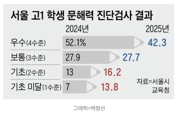 안녕하세요 솔루니 충북교육국입니다^^ AI시대, 문해력 위기 문해력 '기초 이하' 1년 만에 10% 증가 서울지역 고등학교 1학년 서울 교육청 : 25년 10월 ~12월 591개 초(4,6학년),중(2학년),고(1학년) 학생 약 10만명 대상 ' 서울 학생 문해력 . 수리력 진단 검사 " 결과 일상 생활에서 접하는 정보를 읽고 적용하는 능력 측정 1) 기초 미달 (1수준 ) - 13.8% / 전년대비 6.8%증가 2) 기초 ( 2수준 )- 16.2% / 전년 대비 3.2%증가 3) 우수 ( 4수준 ) - 42.3% / 전년 대비 9.8% 감소 **학교 수업 등을 제대로 이해하려면 문해력 ' 보통 ( 3수준 ) ' 되어야 !!! 원인 : 중학생 때부터 문해력 수준 급격히 높아지는 반....... <img src="https://blogthumb.pstatic.net/MjAyNjA0MjFfMjU1/MDAxNzc2NzM1MjE0NTc1.rwKtkKJDhSSLobauMEIX6AM2DpRw4-FYh1PwZWref8kg.r5GE3S2QdkvrmqIwAzWwjFDE6-SCyq6D9Hlbx2heuqcg.JPEG/1776734848838.jpg?type=s3" />
