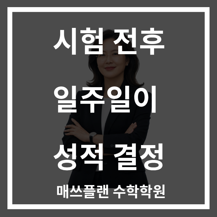 매쓰플랜 영옥쌤이 궁금하다면 아래 글을 클릭해 보세요. 아이들과 함께 자라온 매쓰플랜의 시작 이야기! 저는 이런 학생을 돕고 싶습니다! 수학, 다시 즐거워질 수 있습니다! 시험 일주일 전, 이렇게 해보세요 "시험 직전에 뭘 해야 하나요?" "시험 끝나고 나서는 어떻게 해야 하죠?" 매년 중간고사, 기말고사 시즌이 되면 학부모님들과 학생들에게 가장 많이 받는 질문입니다. 오늘은 20년 현장 경험을 바탕으로, 수학 시험 전후 관리법을 솔직하게 정리해 드리려고 합니다. 조금만 방향을 바꿔도 점수가 달라진다는걸, 수많은 학생들을 통해 직접 확인했습니다. D-7 ~ D-5 : 새 문제보다 '내 오답&#x....... <img src="https://blogthumb.pstatic.net/MjAyNjA0MjFfMTA1/MDAxNzc2NzYwMTY4OTMx.gfYZ4E5FqSb4qcBfd-e7DRWrUhIChJM0j4mys-fvAs0g.Vk4gm2OxiXDWHboXYXKzoCPjWUUNZQdvN-LAAKLADUAg.PNG/2.png?type=s3" />