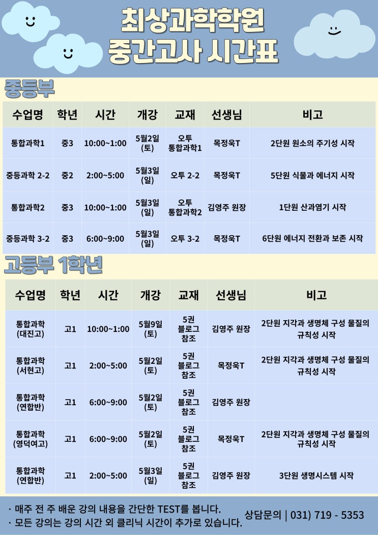 안녕하세요 최상과학학원입니다. 중등부, 고등부 1학년 시간표입니다. 중등부의 교재는 각 학 년에 맞는 오투 교재를 사용을 합니다. 토 10시~1시는 중학교 3학년 대상으로 선행반 통합과학1이 개설됩니다. 5권의 교재 목록입니다. 자이스토리 통합과학1 1등급 만들기 통합과학1 완자 기출픽 통합과학1 EBS 개념완성 문항편 통합과학1 하이탑 기출탑티어 통합과학1 수업시간에 1등급 만들기 교재는 단원별로 개념 설명 후 문제풀이를 합니다. 자이스토리 통합과학1, 완자 기출픽 통합과학1 EBS 개념완성 문항편 통합과학1, 하이탑 기출탑티어 통합과학1 4권의 교재는 배운 단원에 대해서 숙제입니다. 과학 수행평가 및 생기부 교과는 학생이 도움....... <img src="https://blogthumb.pstatic.net/MjAyNjA0MjZfMTI1/MDAxNzc3MTg2Njg3Mzkx.lukJgpXw7iiVrMPTIxbP_cms6MmkIR0-ZLVD-9thNHwg.MOOhNma0fCNyzhcmZs2CnsJW2fv5zEfQ_YQXBlK7fwog.JPEG/001.jpg?type=s3" />