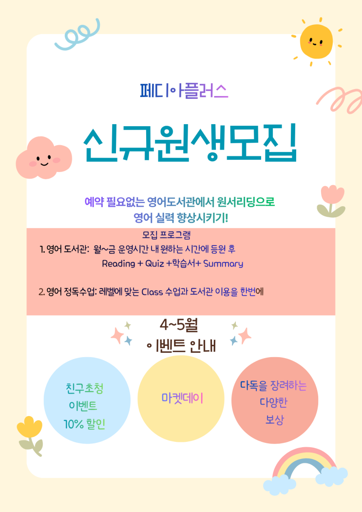 안녕하세요! 굿샘영어학원입니다. ☺️ 본 프로그램은 학생들의 영어 실력을 체계적으로 진단하고, 문법·독해·어휘·서술형 능력을 균형 있게 향상시킬 수 있게끔 설계되었습니다. 초등학교, 중학교의 영어교육과정은 크게 변동되기 때문에 적응하는 데 어려움이 생길 수 있어요. 따라서 먼저 레벨 체크를 통해 현재 실력을 정확히 파악한 뒤, 개인별 맞춤 학습을 진행하여 약점을 보완하고 강점을 극대화하는 것이 가장 중점이 됩니다. 각 파트는 기초부터 심화까지 단계적으로 구성되어 있으며, 반복 학습과 오답 관리 시스템을 통해 학생들의 학습 진도가 어느정도 진행되었는지 확인해가며 교육합니다. 특히 어휘는 장기 기억을 목표로 하고, .......