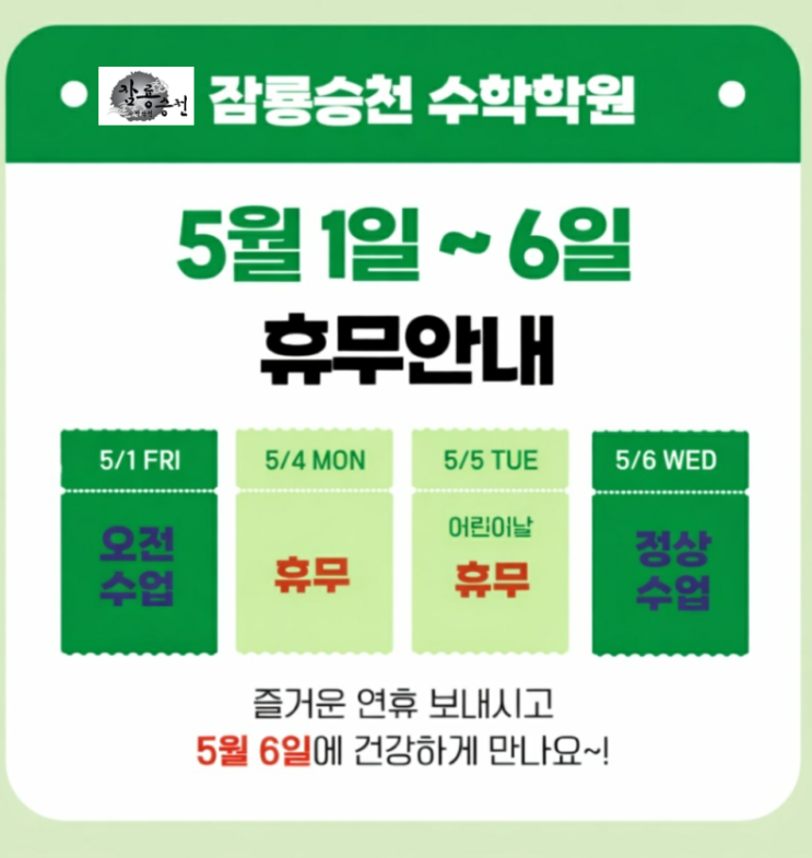 안녕하세요 잠룡승천 분당캠퍼스에서 5월 휴무 안내드립니다. 하단에 일정과 시간 꼼꼼하게 확인 부탁드립니다. ******스카이룸(클리닉룸)은 학원 운영시간과 동일합니다. ▶2026년 5월 1일(근로자의날) : 운영시간 변경 정규 수업 진행되며 시간 변동 있습니다. -고등 수업 시간 : 10:00 ~ 15:00 -중등 1부 : 10:00 ~ 13:00 (본 수업 5시인 학생) -중등 2부 : 12:00 ~ 15:00 (본 수업 7시인 학생) ▶2026년 5월 2일(토요일) : 정상수업 진행합니다. -고등 수업 시간 : 10:00 ~ 15:00 -중등 1부 : 10:00 ~ 13:00 -중등 2부 : 12:00 ~ 15:00 ▶2026년 5월 4일(월)~5월 5일(화)(어린이날) : 학원 휴무일입니다. 문의사항 있으시면 학원으로 연락주....... <img src="https://blogthumb.pstatic.net/MjAyNjA0MTVfMjA3/MDAxNzc2MjQ1MTcyMjMy.HnYEfUhqleX1gNqTmX47krENGSQEy6mTWL-JrQGWvz4g.piTUFRczO4HtYdubpyBvNpLLRf0ied-Wai81C4LWw_0g.PNG/image01.png?type=s3" />