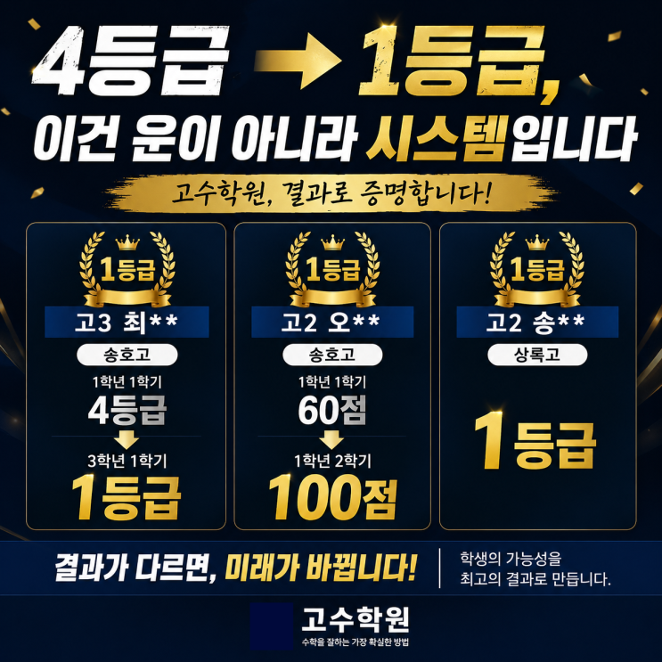 “4등급 → 1등급, 이건 운이 아닙니다” 솔직히 말해보겠습니다. 수학 성적이 안 오르는 이유, 머리가 나빠서도 아니고 노력을 안 해서도 아닙니다. 방법이 틀렸기 때문입니다. 고3 최** 송호고 1학년 1학기 4등급 → 3학년 1학기 1등급 고2 오** 송호고 60점 → 100점 고2 송** 상록고 1등급 이 결과, 특별한 학생이라서 나온 걸까요? 아닙니다. 시스템이 바뀌었기 때문입니다 왜 대부분의 학생은 성적이 안 오를까? 수학 공부를 이렇게 합니다. 개념 듣고 문제 풀고 틀리면 설명 듣고 넘어감 그리고 시험기간이 되면 “다 까먹었습니다” 이걸 반복합니다. 고수학원은 다르게 합니다 우리는 “이해”가 아니라 **“혼자 다....... <img src="https://blogthumb.pstatic.net/MjAyNjA0MjVfMjk0/MDAxNzc3MTA5MjAzMDAz.li3J0sxCC_3PA7ESqrCMdsxE1sFjbRMuEc5QK9QpIaAg.Y5WS9kfhPk1r1wNNhk8WAAudfEQSoaltzSzIaAPsHdgg.PNG/2026_1-1%C1%DF%B0%A3%B0%ED%BB%E7.png?type=s3" />