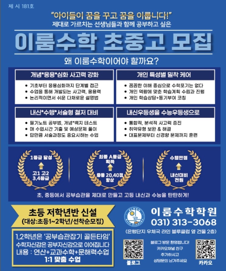 드디어 예쁜 옥외광고판이 설치되었습니다^^ 학원 창문에 현수막을 걸까 생각하다가 학원 건물 옆 주차장 입구쪽 벽에 옥외광고판을 설치하기로 결정했습니다. 야간에도 내용이 잘 보일 수 있도록 조명도 설치하구요^^ 쨘!! 저희 제자들이 밤에도 잘 보이고 예쁘다고 이야기해줘서 고마웠습니다^^ 어머니들께서도 몇 분 말씀하시네요 의도치않게 좀 분위기 있어 보여요ㅎㅎㅎ 밤 10시가 다 되어가는 이 시간에도 중간고사 대비하느라 학원에서 함께 정신없이 열공중인 우리 제자들! 모두 화이팅!!! 분명히 모두 잘 될 것 같은 확신이 듭니다^^ "아이들이 꿈을 꾸고 꿈을 이룹니다. 이룸수학이 함께 합니다." <img src="https://blogthumb.pstatic.net/MjAyNjA0MTZfMTEx/MDAxNzc2MzQyOTcwMzUw.6X-raN1iCU9blXfEdsZ_zrFGTanPMS3DsjTpkRuK420g.Q20efCzYX6qRgeFTRuuz9-PAtKxlfRkMCKeMWCLNvlEg.JPEG/%BF%C1%BF%DC%B1%A4%B0%ED%C6%C7-%C3%D6%C1%BE.jpg?type=s3" />