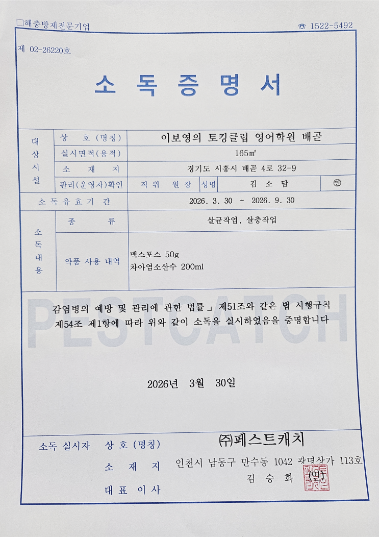 안녕하세요, 토킹클럽 어학원 배곧 캠퍼스입니다 아이들이 매일 머무는 공간인 학원에서 가장 중요한 것은 무엇일까요? 바로 안전하고 깨끗한 환경입니다. 그래서 토킹클럽 어학원 배곧 캠퍼스는 정기적인 전문 소독을 통해 항상 쾌적한 학습 환경을 유지하고 있습니다. 전문 업체 정기 소독 진행 토킹클럽 어학원 배곧 캠퍼스는 전문 소독 업체를 통해 체계적인 관리가 이루어지고 있습니다. ✔ 살균 + 살충 작업 동시 진행 ✔ 법적 기준에 따른 소독 실시 ✔ 정식 소독증명서 발급 완료 단순한 청소가 아니라 전문적인 방역 관리를 진행하고 있다는 점이 중요합니다. 소독 증명으로 확인되는 관리 수준 이번에도 토킹클럽 어학....... <img src="https://blogthumb.pstatic.net/MjAyNjA0MTdfMTc0/MDAxNzc2NDExODY1OTc4.JtUnv0sG3dUzDExzQfNi5uHGVVSuZbKhrOyDOYiqsT4g.mtV_5qAckNq2WBMv7rCFk3DZpJzy8LVO0nFNvSVFIqcg.PNG/image.png?type=s3" />