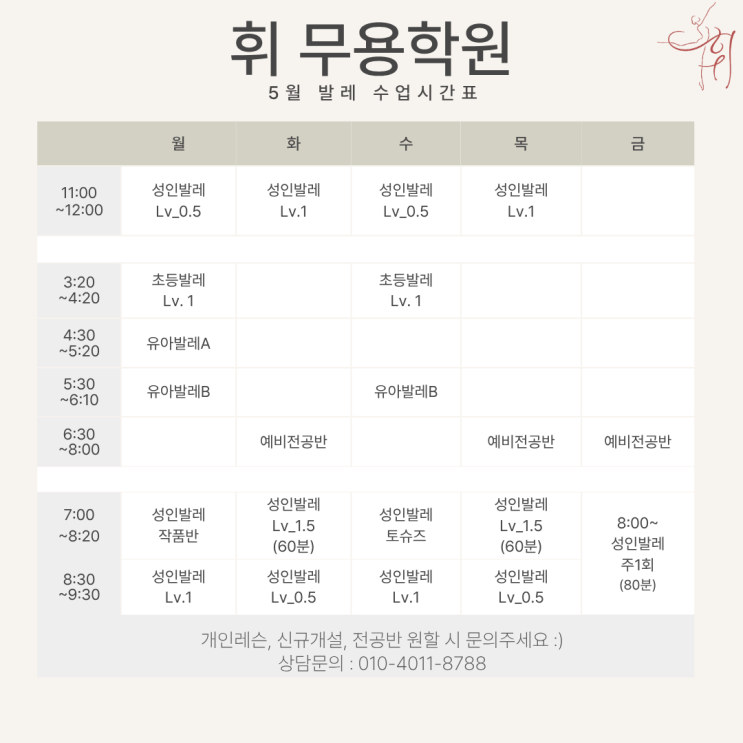 안녕하세요 :) 휘 무용학원입니다. 따뜻한 봄기운이 가득한 5월, 휘 무용학원의 발레 수업 시간표를 안내드립니다. 성인발레, 유아발레, 초등발레, 예비전공반까지 다양한 연령과 수준에 맞춘 수업이 준비되어 있습니다. 특히 성인발레는 오전반 / 저녁반 / 작품반 / 토슈즈 / 주1회반까지 세분화되어 있어 취향과 일정에 맞게 선택하실 수 있습니다. 유아 및 초등 발레 수업은 아이들의 신체 발달과 표현력 향상, 바른 자세 형성에 도움을 주며, 예비전공반은 보다 전문적인 훈련이 필요한 학생들에게 추천드립니다. 개인레슨, 신규반 개설, 전공반 상담도 가능하니 관심 있으신 분들은 편하게 문의 주세요. 상담문의 : 010-4011-8788 감사합니....... <img src="https://blogthumb.pstatic.net/MjAyNjA0MjBfMjgg/MDAxNzc2NjczMzc0NDcz.MU1pKB4mOV0CVg4ON2lPgEZgrgByZ99VjUalKlXKxxYg.zPMmmqPLTg657u_SlKcfpXi6naH7uicTGcQP3n1Sn18g.PNG/%C1%A6%B8%F1%C0%BB_%C0%D4%B7%C2%C7%D8%C1%D6%BC%BC%BF%E4._%2814%29.png?type=s3" />