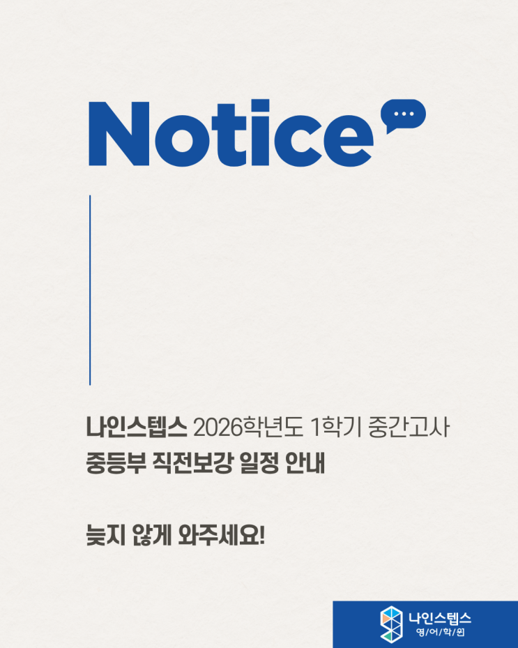 나인스텝스 영어학원입니다. 중간고사가 막바지에 접어들어, 아래와 같이 [중등부] 중간고사 직보 일정을 안내드립니다. 부모님들께서도 착오가 없으시도록 일정 및 시간, 강의실을 꼭 확인해 주시기 바랍니다. ***학생들에겐 계속해서 일정 안내가 나갔습니다. 우리 학생들이 끝까지 최선을 다해 유종의 미를 거둘 수 있기를 바랍니다. 그동안의 노력과 준비가 좋은 결과로 이어질 수 있도록, 중요한 중간고사 직보 수업에 반드시 참여해 주시길 부탁드립니다. ※ ※ 더불어 안내드립니다!!! 직보 일정이 기존 버스 탑승 시간 및 요일과 일치하는 경우에는 기존과 동일하게 버스 이용이 가능합니다. 다만, 직전 보강 수업의 경우에는 버스 차량....... <img src="https://blogthumb.pstatic.net/MjAyNjA0MjNfNzQg/MDAxNzc2OTI4MTY2Mzcx.ILuDRykytgq3arT9W7n1Hh4CsCGDQvghvHOZA9XTOkMg.5JJfJS5YMhAFM6_2oBw5ZHLYjxg40z7xvwTdcwROd0Ig.PNG/KakaoTalk_20260423_160633174.png?type=s3" />