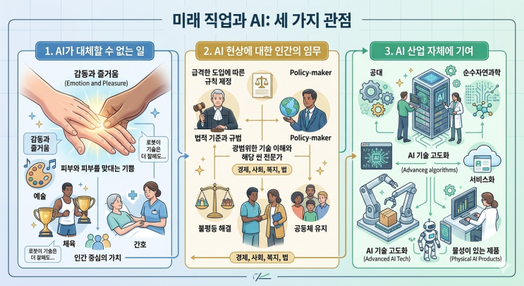 AI 때문에 진로를 어디로 해야 할지 고민이 많으실 줄로 압니다. 아이들 진로 방향 잡으실 수 있게 AI 진로 3가지로 정리해 드릴게요!! 1. AI가 대체할 수 없는 일 2. AI로 인해 발생하는 현상에 대한 인간의 임무에 해당하는 일 3. AI 산업 자체에 기여할 수 있는 일 1. AI가 대체할 수 없는 일 인간이 했을 때 더 큰 감동과 즐거움을 주는 일입니다. 예를 들어, 마사지 같은 일은 로봇이 더 잘할 수는 있겠으나 인간이 피부와 피부를 맞대는 일 자체가 인간에게 큰 기쁨과 만족을 주므로 AI가 대체할 수 있으나 대체할 수 없는 부분이 분명한 일이라고 할 수 있습니다. 예술, 체육 같은 분야도 마찬가지이고, 간호 같은 부분도 그렇습니다. 2. ....... <img src="https://blogthumb.pstatic.net/MjAyNjA0MTJfMjYg/MDAxNzc1OTgwNDk4NDE5.yOSqSZbNbUoC7W5OoYmfMlEYe5uq7cWpdu8BNkjRRpcg.yCt678obB1baMD4EzaaSCAhmRQKPnSZ4xfOmnzHtDewg.PNG/Gemini_Generated_Image_jdyd7ljdyd7ljdyd.png?type=s3" />