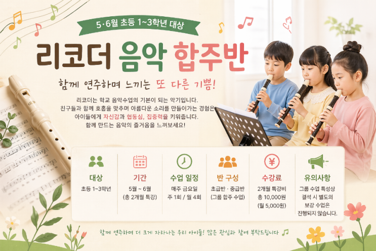 https://youtu.be/Qv_ey-B-_3k?si=8qFNylH-HT3m3dgS 안녕하세요, 맑은소리입니다 5월과 6월 동안 진행되는 초등 1~3학년 대상 리코더 합주반을 안내드립니다. 리코더는 학교 음악수업에서 가장 기본이 되는 악기로, 아이들이 처음으로 ‘함께 연주하는 경험’을 쌓기에 아주 좋은 시작점입니다. 단순히 혼자 연주하는 것을 넘어, 친구들과 호흡을 맞추며 만들어가는 합주는 아이들에게 또 다른 즐거움과 성취감을 선물합니다. 특히 합주를 통해 - 서로의 소리를 듣고 맞추는 집중력 - 박자와 리듬에 대한 이해 - 협동심과 자신감 을 자연스럽게 키울 수 있습니다. 혼자서는 느끼기 어려운 “함께 만들어내는 음악의 기쁨”을 경험하게 될....... <img src="https://blogthumb.pstatic.net/MjAyNjA0MjNfMjMy/MDAxNzc2OTE5MTk4MDk5.y3iy94OZYaKRgr6FHna7VbdwRAEDh4OSYn14q9itVzUg.ioj9AtAYZPx4XdYF-iCg6mZ5pj5p9MsqPfliz7r_mxYg.PNG/900_file_000000005928720b970db30cd4fb98d8.png?type=s3" />