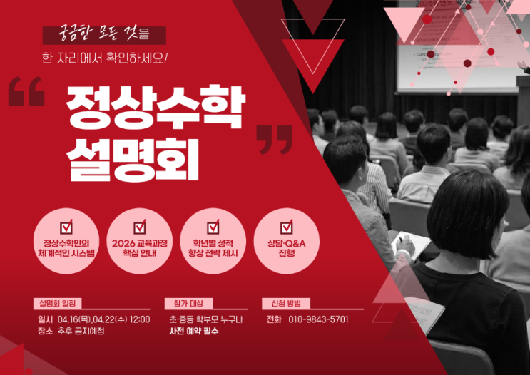 정상수학 브랜드 런칭 안내 많은 학부모님들의 관심 속에정상어학원에서 ‘정상수학 프로그램’을 새롭게 런칭합니다. 정상수학은 단순 문제풀이가 아닌개념 이해 → 개념 활용 → 내신 완성 → 심화 사고력& 경시대회 출전단계별로 실력을 완성하는 수학 프로그램입니다. ✔ 수업 전 온라인 개념 선행 학습 시스템(무료제공) ✔ 매 학기 테스트를 통한 전국 학생들 대비 각 학생들의 성적 분포 리포트 제공 ✔ 정상어학원과 동일하게 무료 클리닉룸&클리닉 수업 제공 ✔ 학부모님들이 만족 하실수 있는 정상만의 차별화된 1:1 밀착 관리 ✔ 사고력 및 문제 해결력 강화 ✔ 문제를 읽는 힘을 키우는 개념 활용 4단계 학습 전략✔ 정규 과....... <img src="https://blogthumb.pstatic.net/MjAyNjA0MDhfMTE2/MDAxNzc1NjM1Njc5OTE2.jRqtlKu91krd3eetPd12ahldSXbnwJTlPKtUMJX-8nQg.DiLqn6xp_gypYy-vL3TBpZ6MtO3BqMNLh2YaeWzKV8kg.PNG/900_1775634535009.png?type=s3" />