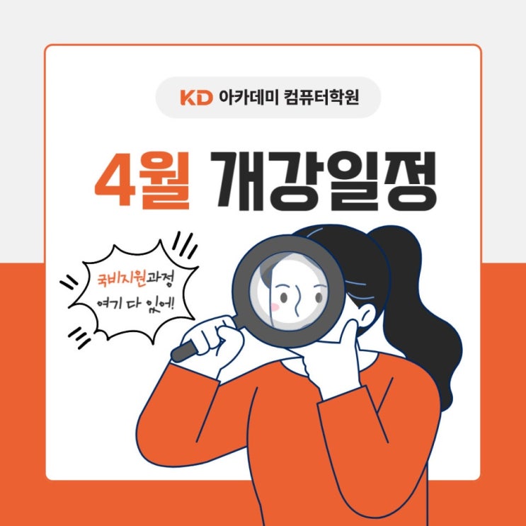 안녕하세요~! 김포·사우동·구래동과 가까운 김포시 장기동 국비지원 컴퓨터학원 KD아카데미 김포캠퍼스입니다. 벌써 날씨가 많이 더워졌죠? 지난주 벚꽃을 마지막으로 확 더워진 오후날씨가 다가올 여름이 체감됩니다. 4월중순인데 말이죠 ㅠㅠ 더 더워지기전에 여러분들과 함께 4월 마지막을 달려가는 KD아카데미 김포캠퍼스의 개강일정 함께 보실까요? 지금 딱 컴퓨터 공부하기 좋은 계절이니까요~~ https://blog.naver.com/kdacgp/223953541181 개강일정 확인 후, 수강희망한다면 학원으로 방문일정 예약해주세요 :) ⓐ 방문 원서작성 기준, 자리배정됩니다. ⓑ 인기 많은 수업은 자리가 빨리 마감될 수 있습니다. ⓒ★당일등록 불가★하....... <img src="https://blogthumb.pstatic.net/MjAyNjA0MThfMjMw/MDAxNzc2NDg4MTA5MDA1.KczC5oNPyUZHPxpOyL7Y5toG9O2j1_h7Qqlwxy6HBLIg.tMPLmUHtVArTDwgEzDRdIKZlH-MK5-7afpgg1ybb1P8g.JPEG/001_%281%29.jpg?type=s3" />