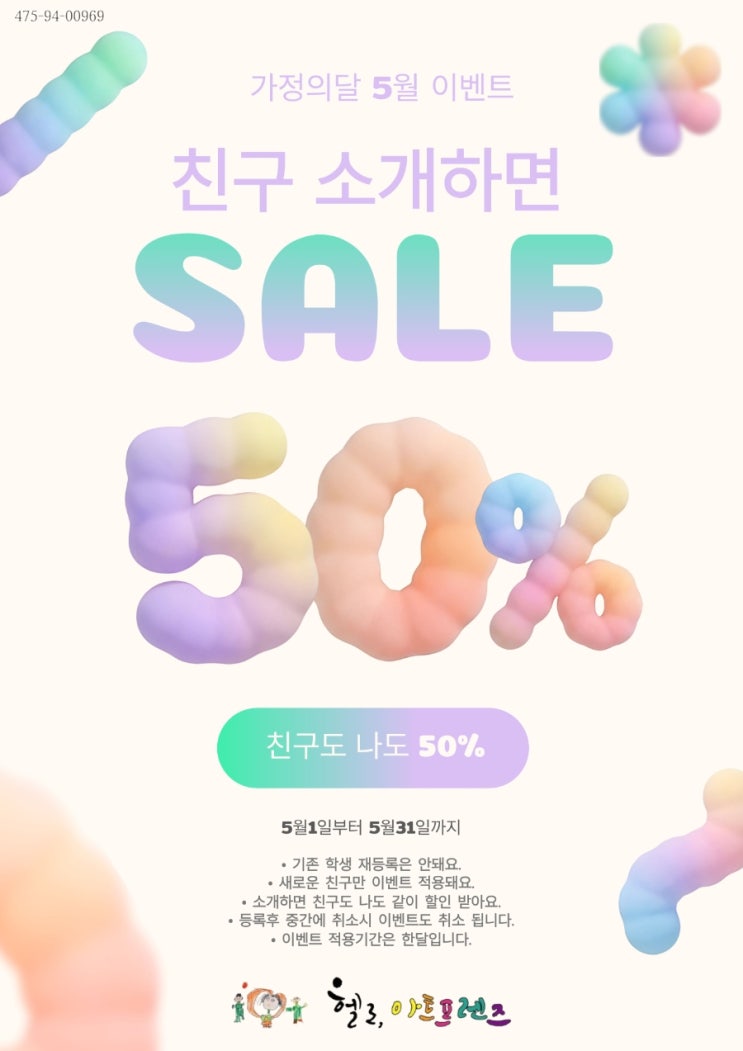 5월 이벤트 5월 이벤트 합니다. 친구 소개 이벤트!!! 소개하면 친구도 나도 원비 50%할인 대박이죠???? 얼른 소개소개 해주세요~~~~ #천안미술 #청당코오롱하늘채미술학원 #헬로아트프렌즈미술학원 #미술학원추천 #청당동미술학원 #어린이미술 #청수동미술학원 <img src="https://blogthumb.pstatic.net/MjAyNjA0MjRfMTMx/MDAxNzc3MDEzMjE3OTEw.kGZNu_NkTLyGFVb1PVlDM8pclKMoPBOtzJvtU2MCRZog.a6Qt5KACP-OQRV1c8pj5AdG6Nw1CXaWqBAvX7L7Xa6cg.JPEG/900_%C1%A6%B8%F1%C0%BB_%C0%D4%B7%C2%C7%D8%C1%D6%BC%BC%BF%E4.%283%29.jpg?type=s3" />