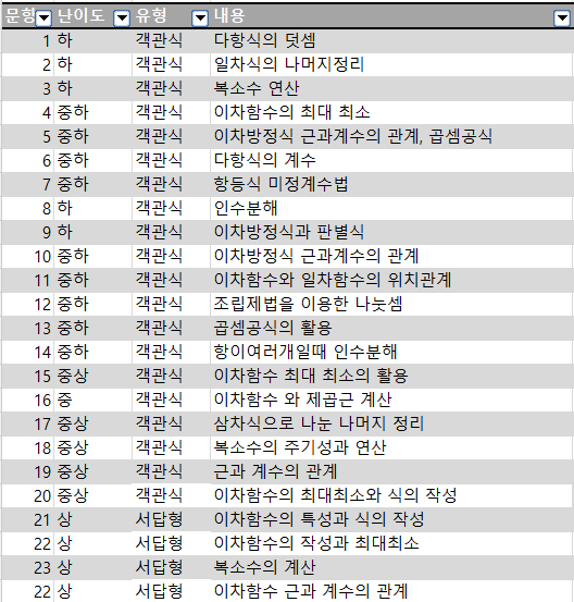 이번 두정고1 중간고사에서는 객관식 20문제 서답형 4문제 총 24문제가 출제 되었습니다. 서답형이라고 항상어려운건 아니지만, 이번 두정고 시험에서는 서답형문제가 모두 객관식보다 더 높은난이도로 출제 되었습니다. ▶1~14번(난이도 하~중하) 각 단원에서 배운 낮은 난이도의 기본 필수 유형입니다. ▶15번~20번(난이도 중~중상) 상위등급을 가르기 위한 문제들입니다. 15번:이차함수 최대최소의 활용문제로 닮음을 이용해야하는 문제입니다. 닮음을 이용해야 해서 난이도는 높은편이지만 기출/문제집 단골문제 16번: 이차함수와 일차함수의 교점을 구하고, 그 값으로 제곱근연산하는 문제입니다. 기본유형 두가지가 혼합된 문제입니다. 17번....... <img src="https://blogthumb.pstatic.net/MjAyNjA0MjRfMjg0/MDAxNzc3MDI5MDgwNzMx.iptuAXUP9VMaqWz21req1Yt5Md-jS4NLvQoVfjDVLFog.wCuXJ8umHvlVg88vs6d9n3-VT9Ol1hoVYa0F5qzzDEAg.PNG/image.png?type=s3" />