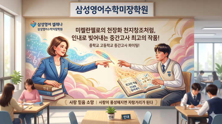 안녕하세요! 학생들의 꿈과 성장을 함께 그려나가는 삼성영어수학미장학원입니다. 어느덧 완연한 봄기운이 느껴지지만, 우리 중학교, 고등학교 학생들은 다가오는 중간고사 준비로 책상 앞에서 치열한 하루하루를 보내고 있을 텐데요. 오늘은 우리 아이들이 지금의 고된 시간을 어떻게 이겨내면 좋을지, 미술사의 위대한 명작 이야기와 함께 학원의 교육 철학을 나누어볼까 합니다. ️ 친구의 시기를 최고의 작품으로 승화하다: 미켈란젤로와 천장화 르네상스 시대의 거장, 미켈란젤로를 아시나요? 그가 남긴 시스티나 성당의 **천장화(천지창조)**는 인류 역사상 가장 위대한 걸작 중 하나로 꼽힙니다. 하지만 이 위대한 작품이 탄생하게 된....... <img src="https://blogthumb.pstatic.net/MjAyNjA0MTlfMTky/MDAxNzc2NTc0NzY0MDk4.ivwI6-xYRgCUZdzr7wsobTxW5n1pUJfheX1d2D5TJMog.UnSJ7OOEdEtD1ZAUeXgQNVT0Yx6l5qLpsWchGvPxH70g.PNG/Gemini_Generated_Image_nxr7bwnxr7bwnxr7.png?type=s3" />
