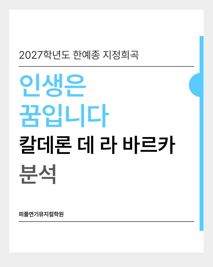 안녕하세요~! 피플연기뮤지컬학원입니다 오늘은 2027학년도 한예종 지정희곡인 [인생은 꿈입니다 - 칼데론 데 라 바르카]를 분석해보려 합니다! ✅인생은 꿈입니다 작품 분석 -작가 : 페드로 칼데론 데 라 바르카 -초연 : 1635년 경 -장르 : 바로크 시대 철학극 / 상징극 -배경 : 폴란드 왕국 -주제 키워드 : 운명, 자유의지, 인간 존재, 현실과 환상 [인생은 꿈입니다]는스페인 바로크 문학을 대표하는 작품으로, 인간의 삶을 “꿈”이라는 개념으로 바라보며 현실의 본질과 인간의 선택을 깊이 있게 탐구하는 철학적 희곡이다. ✅줄거리 핵심 폴란드의 왕 바실리오는 아들 세히스문도가 폭군이 될 운명이라는 예언을 듣고, 그를 태어나자마....... <img src="https://blogthumb.pstatic.net/MjAyNjA0MjBfMjIg/MDAxNzc2NjU0NjczNjI3.UMtzqRzR_MYEHr6eTGHYNA-V53WkdXKp8cnvbHV-CnEg.AYRZYhF9MDffBPP_F9U55SOmrXAV8KG-lUzpPF2TG18g.JPEG/001.jpg?type=s3" />