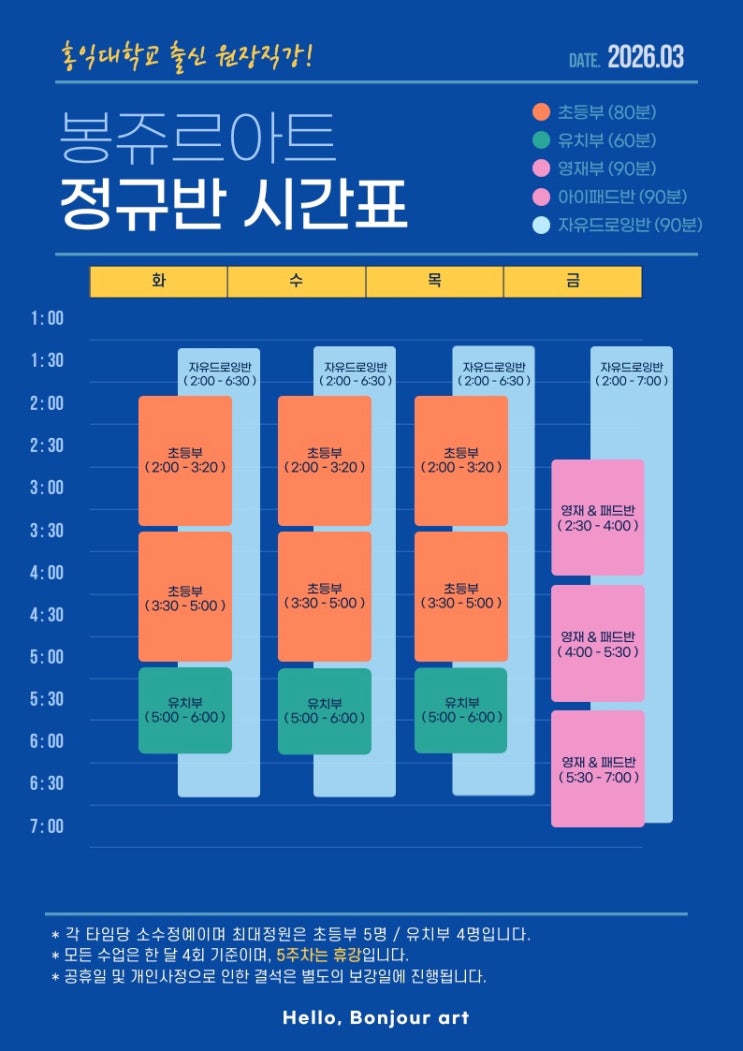 2026년 1학기(3-7월) 시간표 입니다 :) 정해진 정규수업에 맞추기 어려운 친구들의 경우, 일부 유동적으로 시간변경이 가능하니 문의주시면 안내드리겠습니다 :) 문의전화 010.4400.0302 <img src="https://blogthumb.pstatic.net/MjAyNjA0MjNfMjE3/MDAxNzc2OTA0MDk2MTAx.Fx24zBjiTz4uY0pHHVoQoAlOEgu249xHJONGL9dW3JIg.nnIYxjZOFIg31uQgrRNauOQBhCbu7UjPaZoez4O-Elwg.JPEG/IMG%A3%DF0991.JPG?type=s3" />