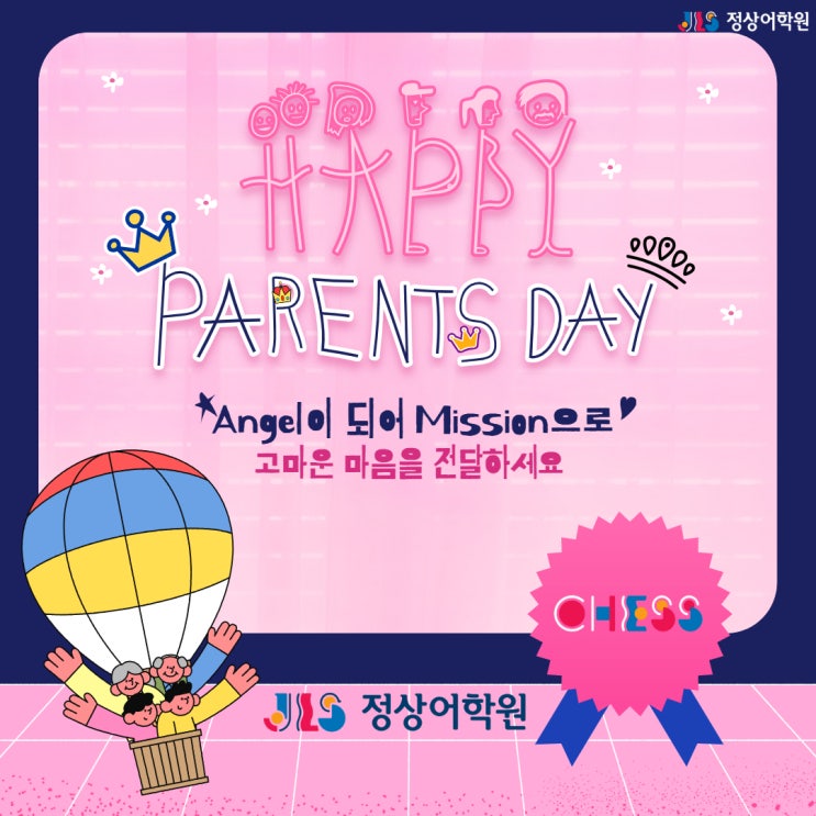 CHESS Dream Tree Mission을 5월 가족의달, 어버이날을 맞아 아래와 같이 진행합니다. 고마운 마음을 전하고 싶은 할아버지, 할머니, 엄마, 아빠, 삼촌, 이모...에게 아낌 없이 표현하고 Dream Tree 스티커도 받아서 Pizza Party 해요! How To Do? 1. 담임선생님께 Angel Mission 카드를 받으세요. -4/20(월)부터 전달 됩니다. 2. Mission 카드에 한국이름, 영어이름 꼭! 표기하세요! 3. Mission기간 : 4/20(월)~5/8(금) 까지 미션을 완료해 주세요! 4. 미션 마다 완료 후 가족 싸인을 받고, 5개 미션 완료 후 기한내에 아무때나 미션 카드를 사직 찍어서 '동작정상어학원' 카톡채널로 전송해 주세요. 5. 반 전체학생이 미션을 완료 하....... <img src="https://blogthumb.pstatic.net/MjAyNjA0MTNfMjMg/MDAxNzc2MDYxNzU0ODU2.IeV9h1DxhaCXRG5qpd1uv7fzWRuPiL7JlLH1xCH-vWkg.FaJBZBZ40dEgnRdT10EgxtPv1B0_QqwChmo6IBqo1scg.JPEG/%BE%EE%B9%F6%C0%CC%B3%AF_%C0%CC%BA%A5%C6%AE.jpg?type=s3" />