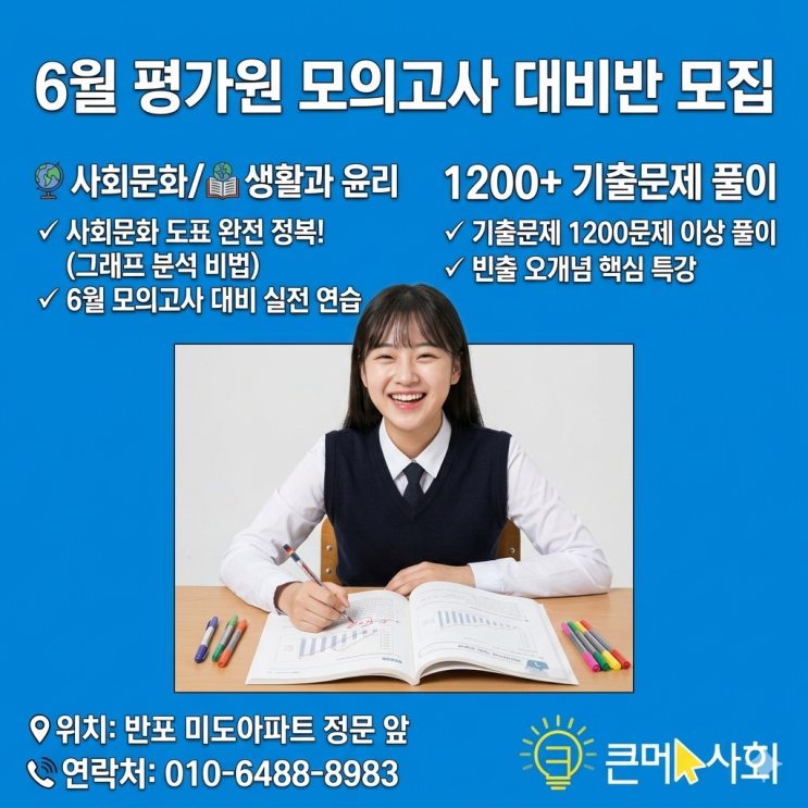 #반포사회학원 #서초사회학원 #고속버스터미널사회학원 #사평역사회학원 #교대역사회학원 #사회문화학원 기간 : 4월 말 ~ 5월 말(한 달 동안, 5월 연휴 기간을 충분히 활용) 자료 : 수능특강 + 자체 기출 문제 교재 + 사회문화 자체 도표 교재 수업 방식 : 일대일 수업 진행 대상 : 사탐 성적이 2등급 미만인 학생, 노베 / 사탐런 학생 환영! <img src="https://blogthumb.pstatic.net/MjAyNjA0MjFfMjE5/MDAxNzc2Nzc1Njc0NTg2.bxJ8f1LORJ0irsFdo12nPCPtRbql2VlCkRKkGKjKP2sg.vhHpPRBpcEKHASxeuRNHKvUH-r4Jhl8Ae_IATiaqSewg.PNG/6%9F%72%C6%F2%B0%A1%BF%F8_%B8%F0%C1%FD1.png?type=s3" />